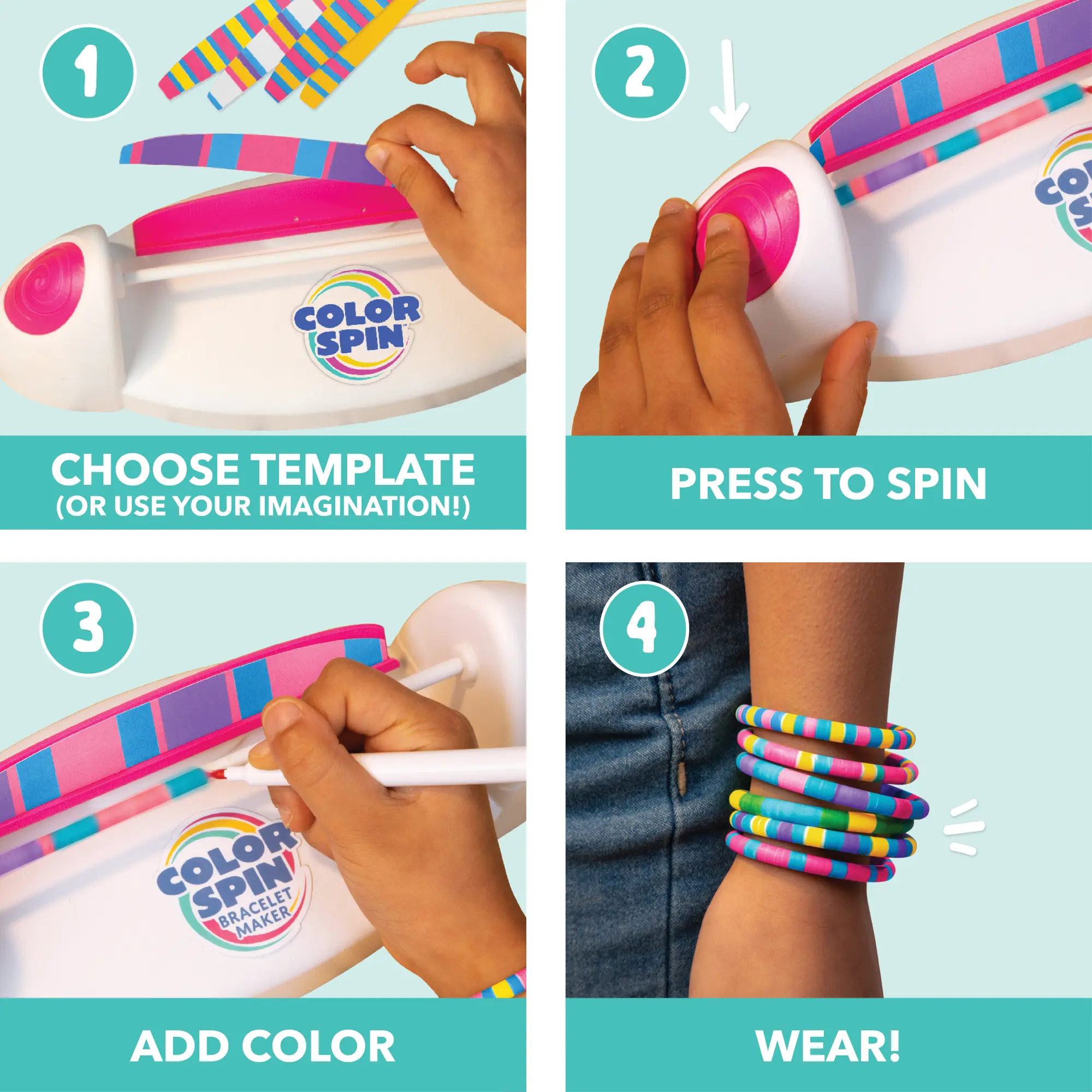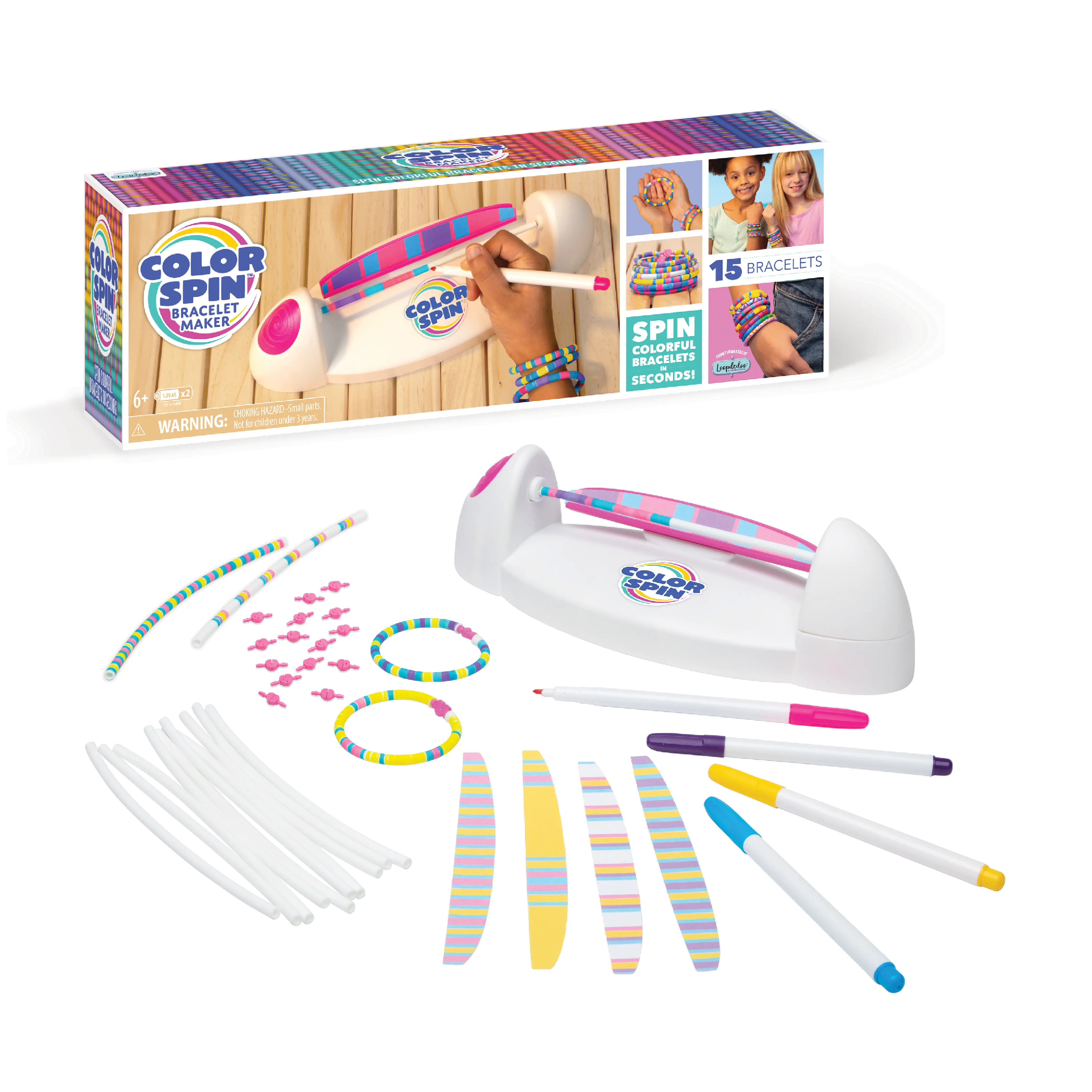 ColorSpin Bracelet Maker allows you to create flawless bracelets without any beads. Just push the button to spin your bracelet and touch the markers to the bracelet tube to add rings of color. Perfect for beginners! 🌈