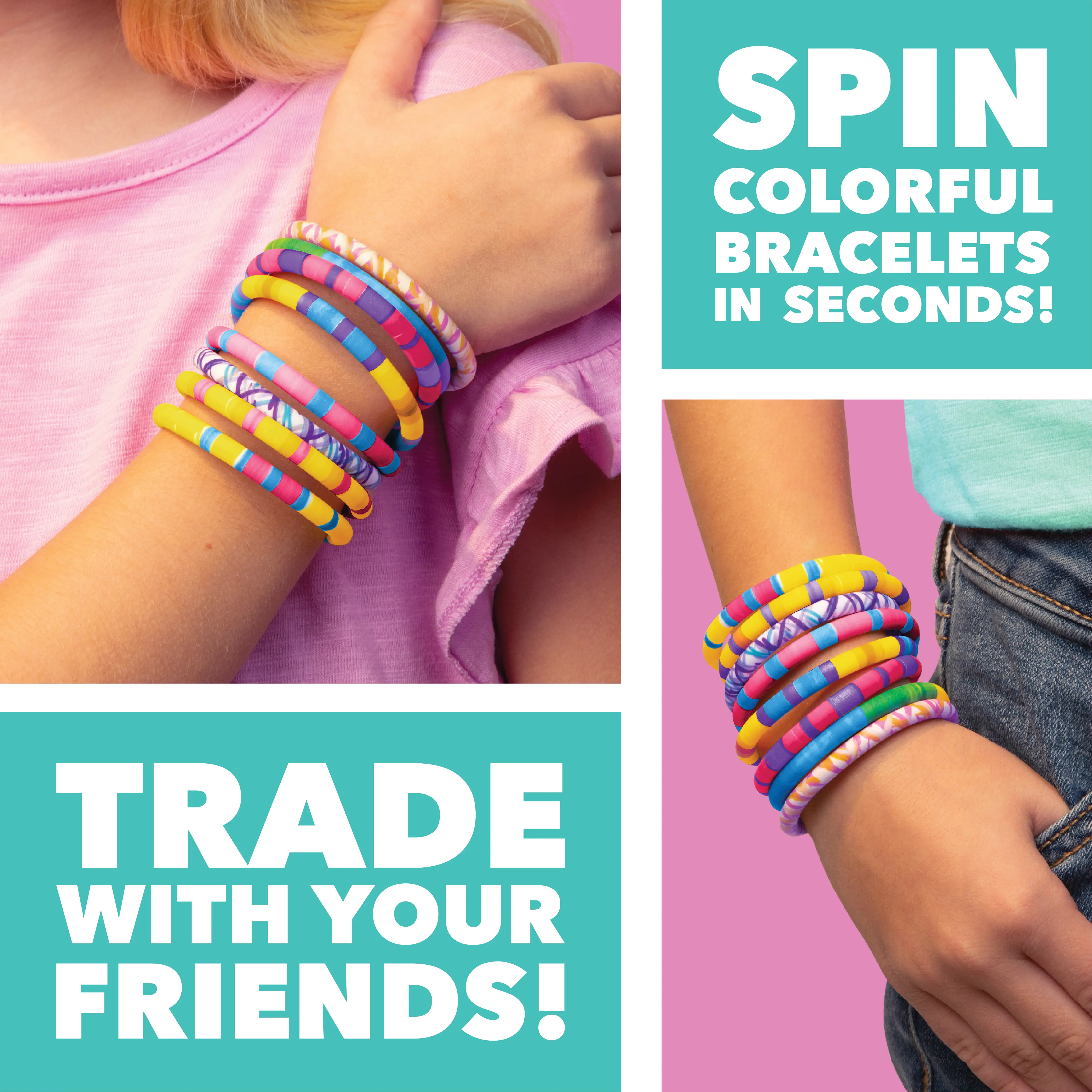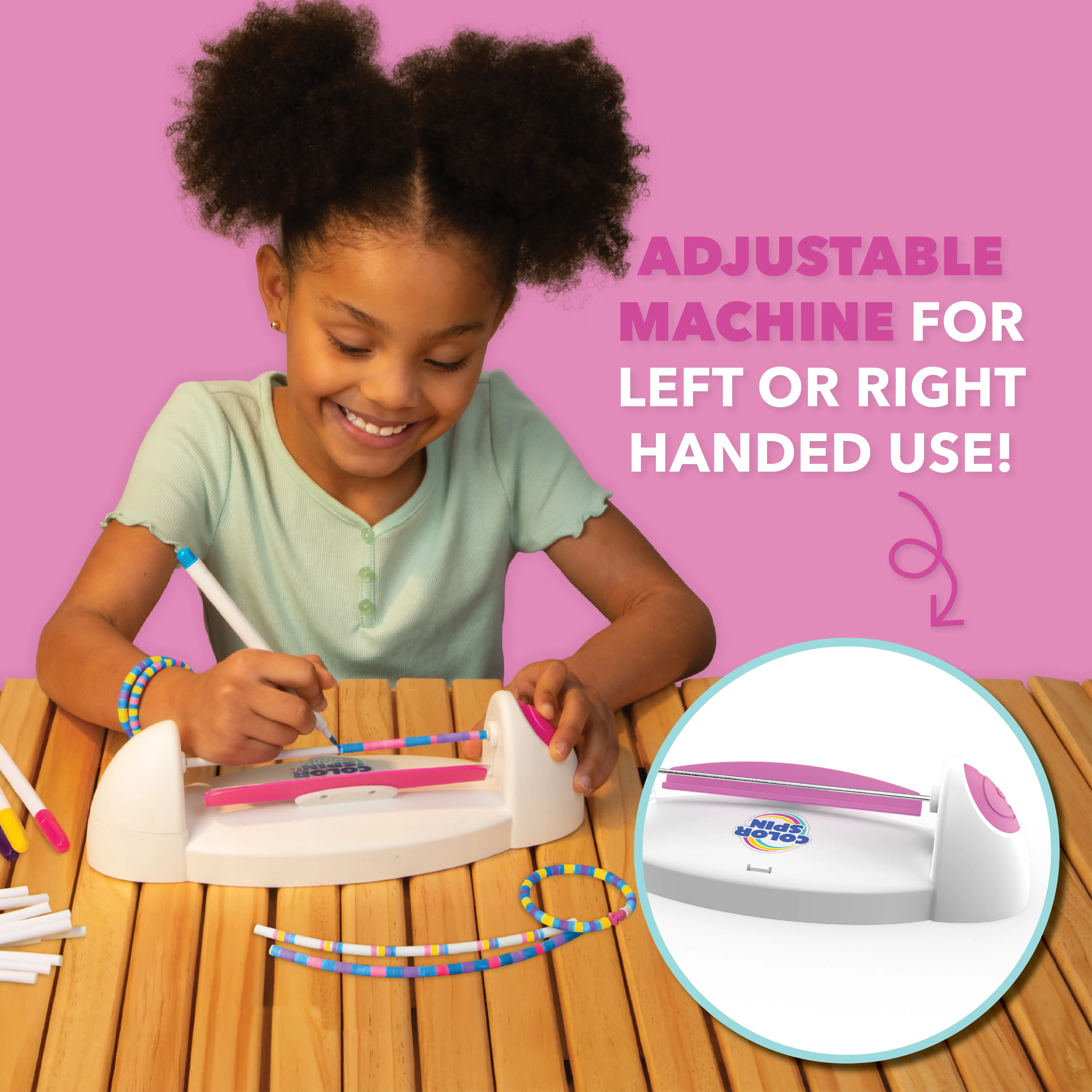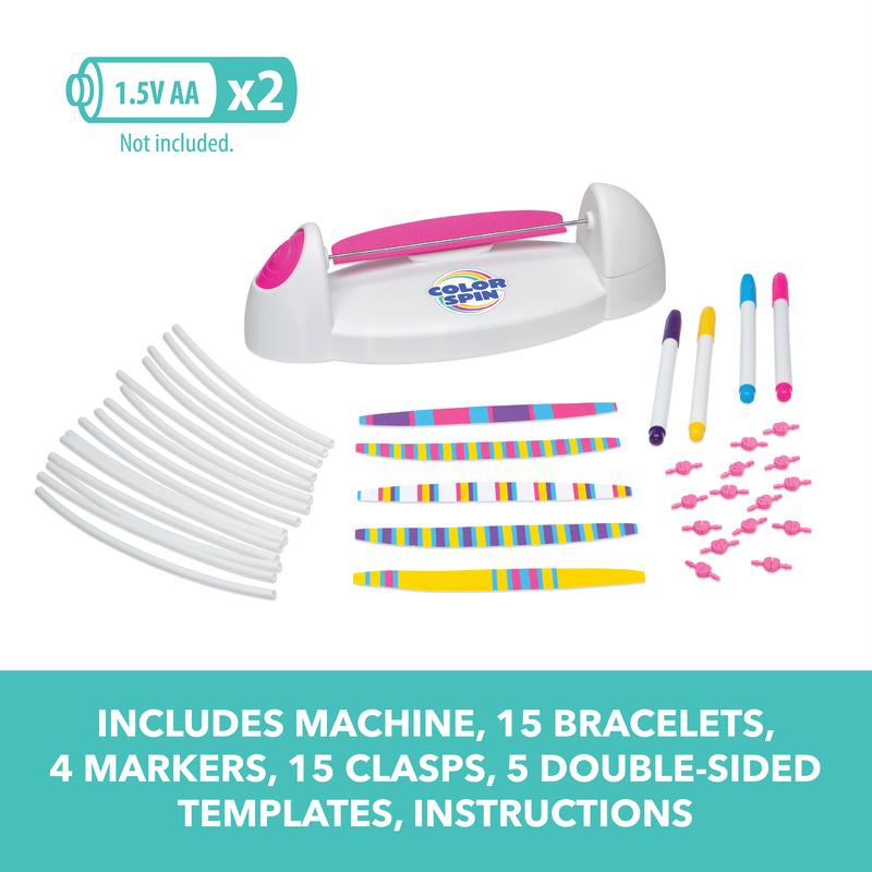 ColorSpin is perfect for making beautiful bracelets easily. Give the kit as a gift or share your favorite finished bracelets with your favorite people! Requires 2 AA batteries (not included). 🎁