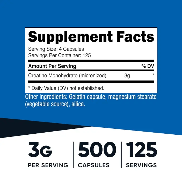 IngredientsCreatine Monohydrate,gelatin capsule,magnesium stearate (vegetable source).