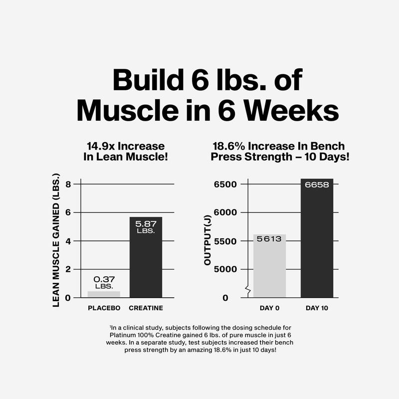 Platinum 100% Creatine delivers 6 lbs. of muscle in 6 weeks and 18.6% strength boost in 10 days. Feel the difference faster with clinically backed results.