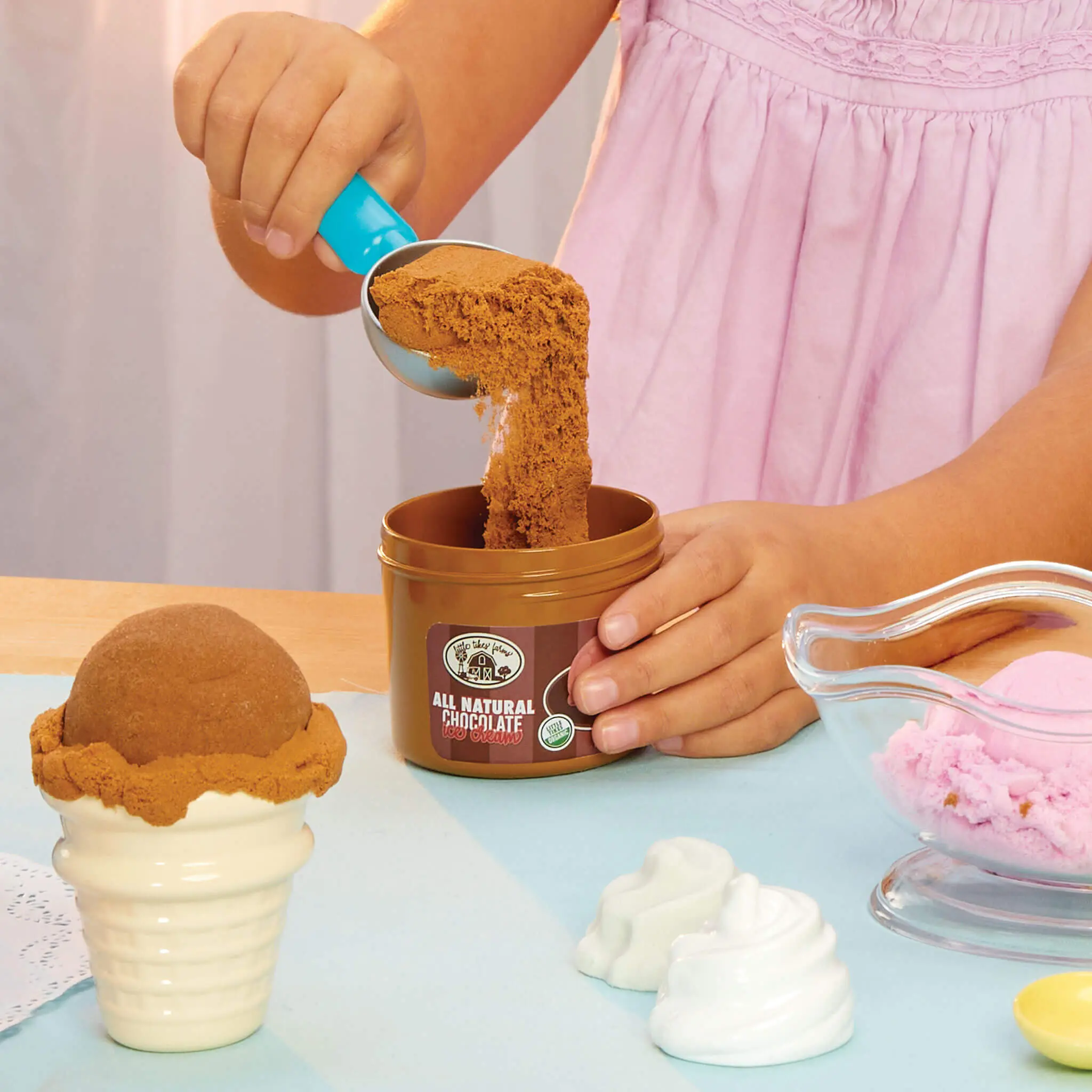 This kit includes hyper-detailed play food, a functional ice cream scoop, a sundae dish, and other utensils, offering a realistic culinary experience. The packaging unfolds into a portable play table, creating a workstation for kids to assemble their sweet treats, whether playing alone or with friends.