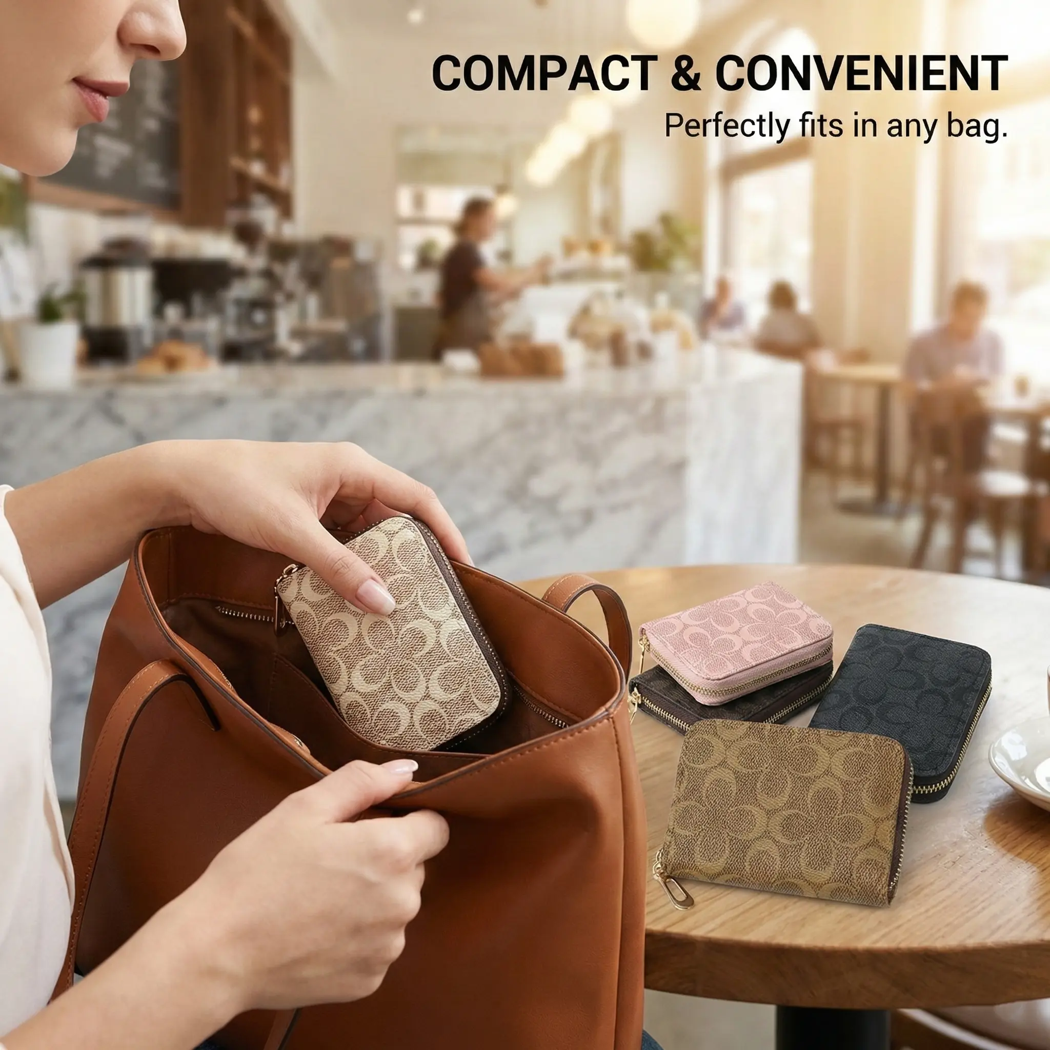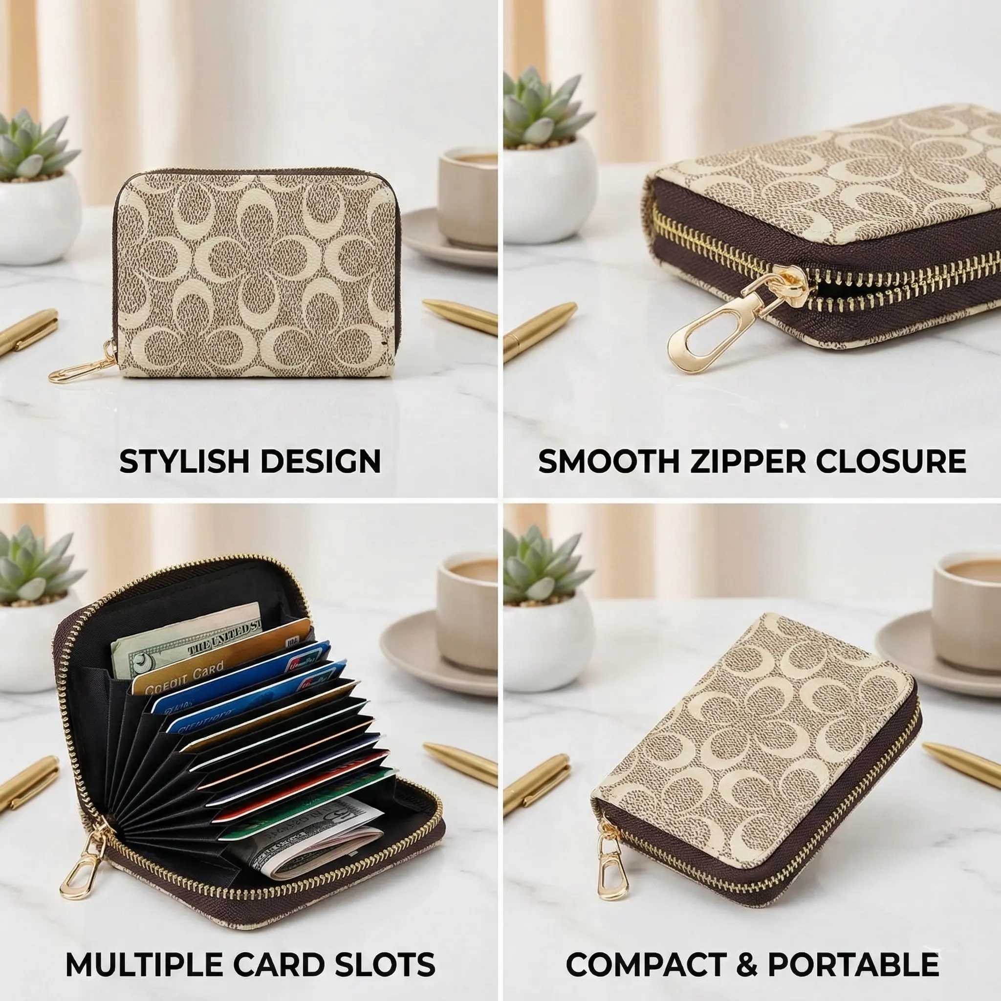 The wallet maintains a slim, lightweight profile that fits comfortably in your purse, pocket, or travel bag. The smooth gold-tone zipper and reinforced stitching ensure durability and easy access to your essentials.