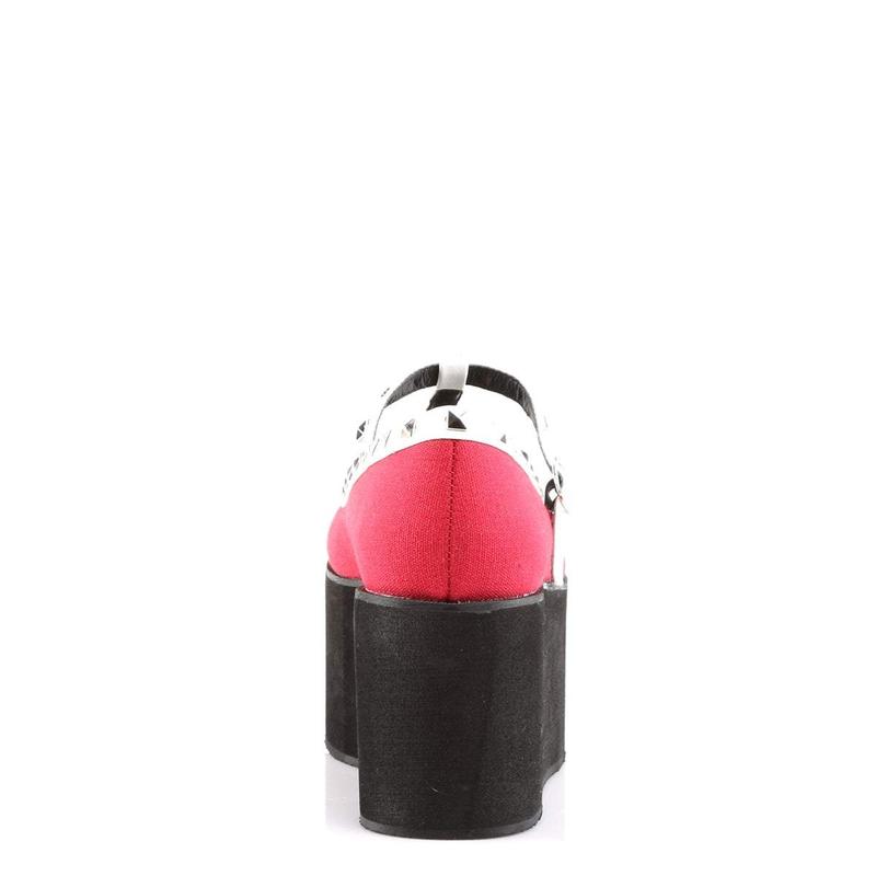 Introducing the Demonia Click-07, a shoe that masterfully combines flair and function. Sitting on a 3 1/4" platform, it’s crafted for those who love to elevate their style. The striking T-strap, made from a contrasting mix of red canvas and black-and-white vegan leather, captures attention in every stride. Embellished with pyramid studs and featuring a chic buckle detail, the Click-07 transitions seamlessly from day to night, promising to add an edgy pop to any outfit in your wardrobe.
