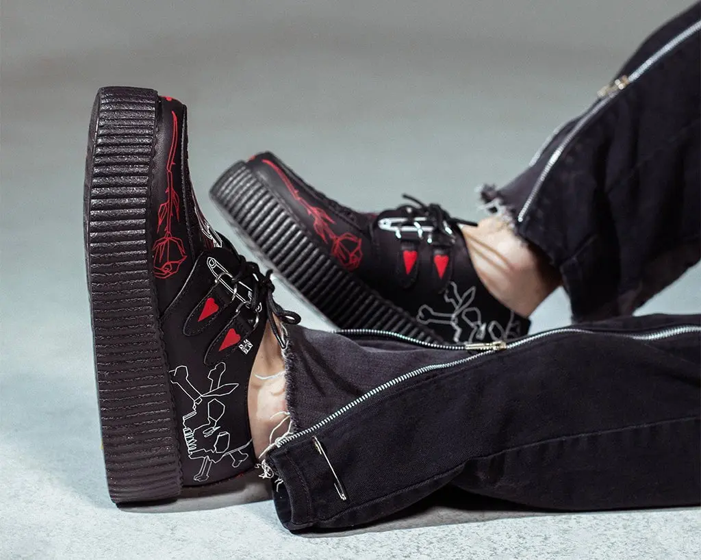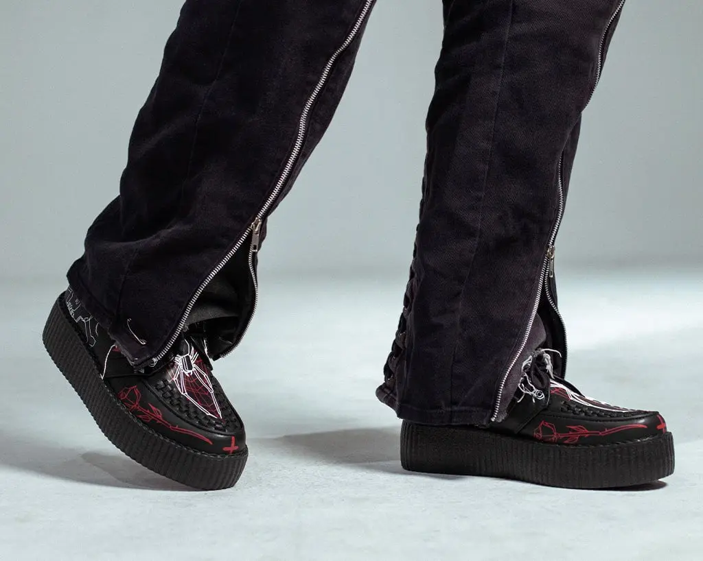 These T.U.K. x Eliza Sidney Creepers feature a black faux leather upper with red and white illustrations. Has a lightweight VIVA mondo sole that is approximately 1 ΒΎβ at the heel and 1 ΒΌβ in the front. Has removable memory foam padding for added comfort.