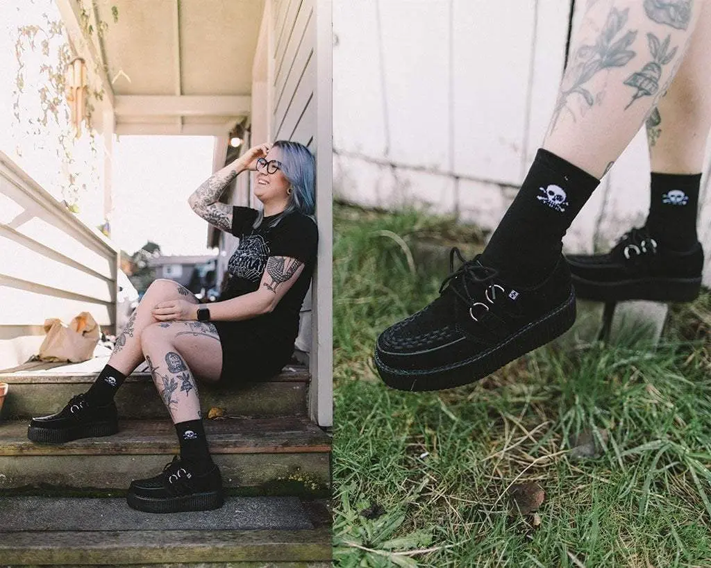 The Classics Never Go Out Of Style. These black suede T.U.K. Mondo Sole Viva Creepers feature the new lightweight and more flexible soles in our traditional 1 7/8" height. These round toe creepers have a black woven interlace, and silver metal D-rings on our patented T.U.K. Skull n' Bones creeper sole design.
