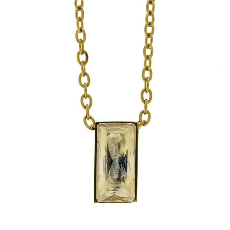 NECKLACE LAYOUT Pendant Dimensions: 7/16" long x 1/4" wide x 1/4" deep Material: Plated Stainless Steel (Yellow Gold Color) Chain: 22" Snake Chain Finish: Polished Stone: Clear CZ