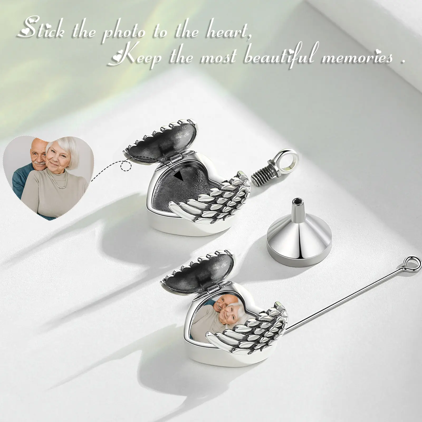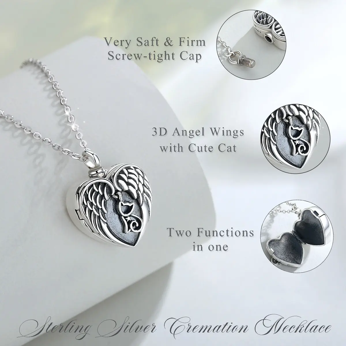 [Angel Wing Picture Locket Necklace] The detailed sterling silver urn keepsake is a wonderful tribute to your loved one. This high quality urn pendant will hold a small amount of cremains in remembrance of your loved one. A threaded stopper assures you that your loved ones cremains are protected inside your keepsake urn pendant.