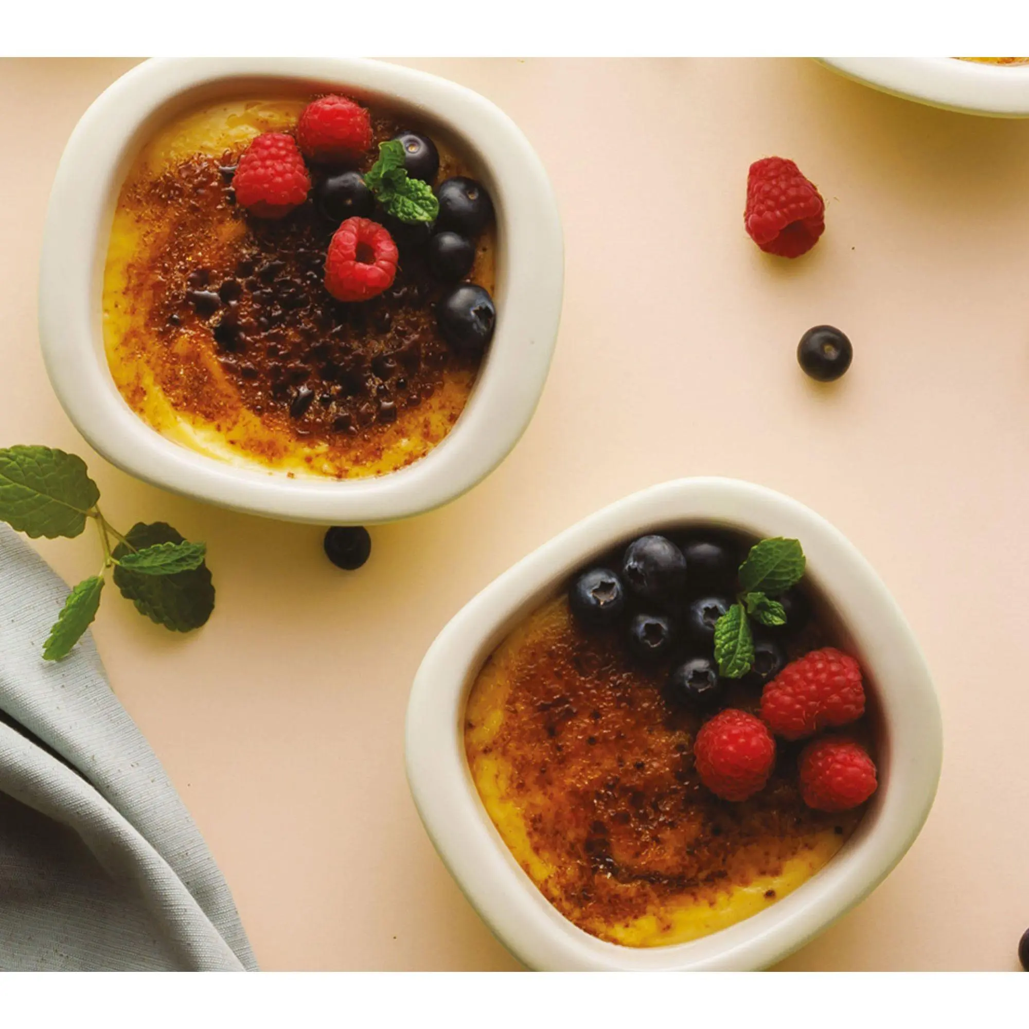 Elevate your dessert presentation with this four-piece set of Balance creme brulee ramekins. These ramekins are perfect for a variety of mini dishes, from quiches to souffles, ensuring even heat distribution for that flawless bake. Their enamel coating and convenient handles make them a practical addition to any kitchen, while the ability to stack them saves valuable space. From BergHOFF.
