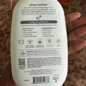 Smells great. Light pistachio but smells amazing when paired with your fragrance. Moisturizes wonderfully. My skin loves it.