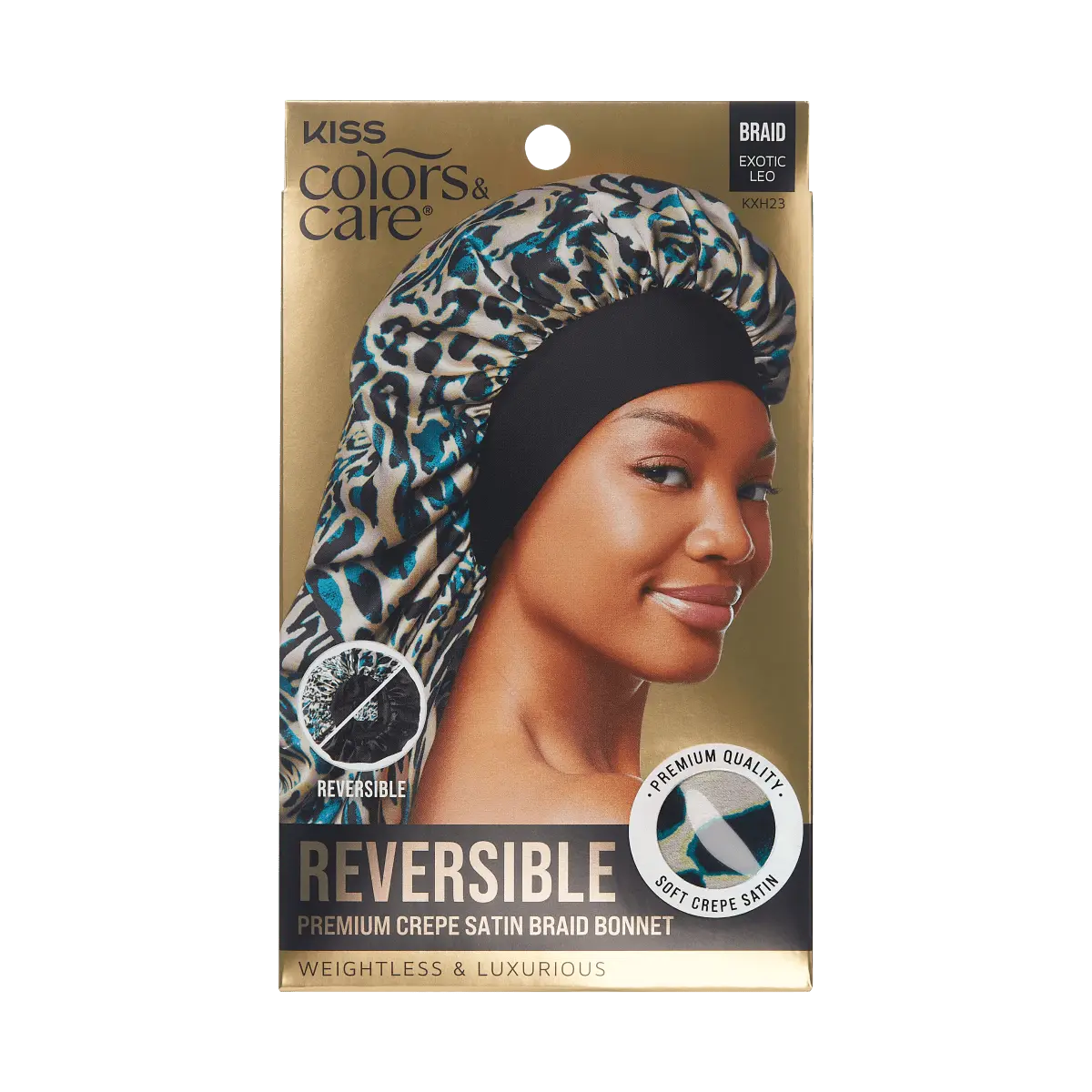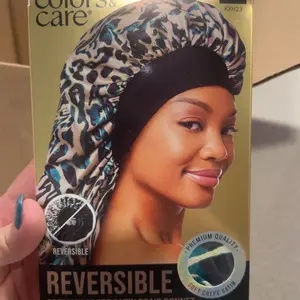 KISS Colors & Care Reversible Braid Bonnet is made with luxurious crepe satin that protects your hair from dryness, friction, and split ends. Made with two different densities of silky polyester to help maintain healthy hair and natural curls.