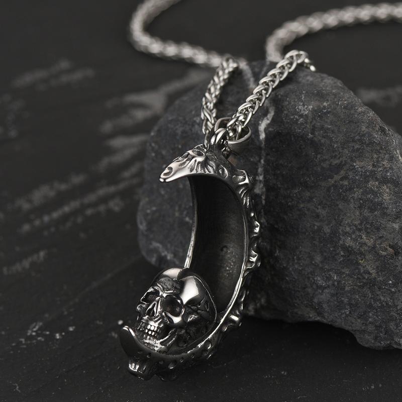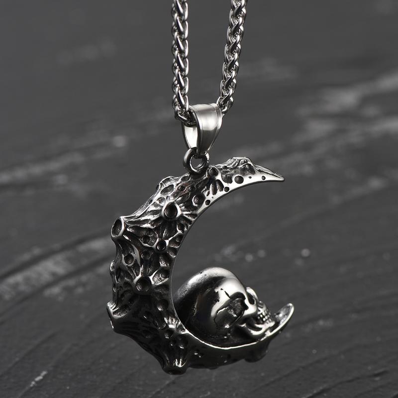 FaithHeart Crescent Moon Skull Necklace Stainless Steel Gothic Necklace