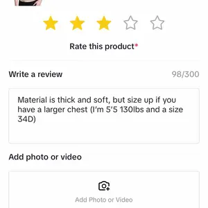 Material is thick and soft, but size up if you have a larger chest (I’m 5’5 130lbs and a size 34D)