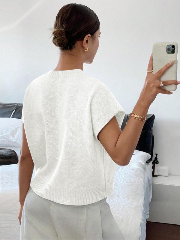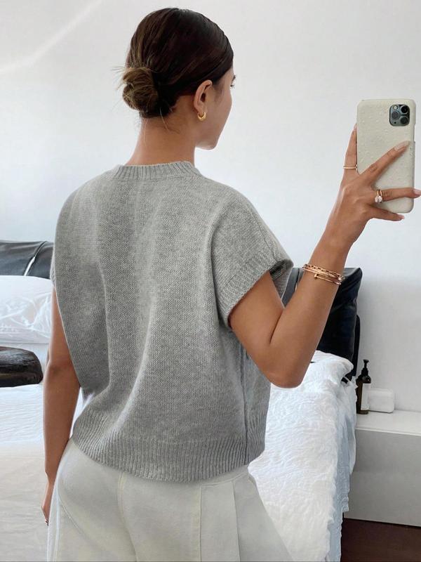 Elegant Round Neck Knit Top for Women, Spring Summer Loose Fit Sweater Vest, Casual Plain Pattern, Stylish Pullover Jacket