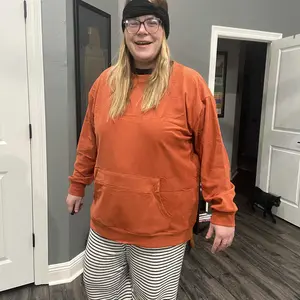 You need this in every single color! It is the softest material I have ever felt. And the pouch with the hood is the best design!!! 5’8” and 190lbs and I’m wearing the Large.