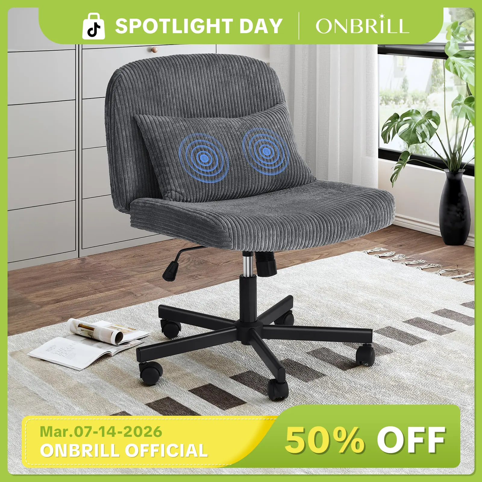 ·MASSAGE LUMBAR CUSHION: ONBRILL criss cross chair with wheels comes with a massage lumbar cushion, providing soothing relief and excellent support for your lower back, can be used as a computer desk chair, etc. USB interface, 55" cord length, easy to use