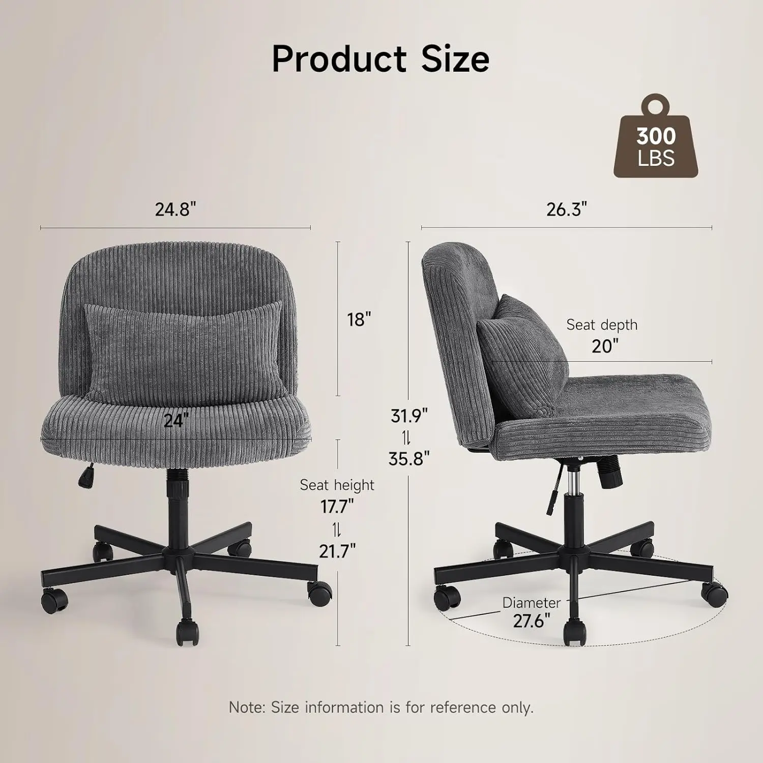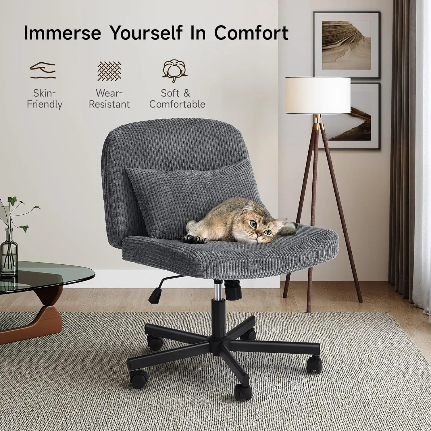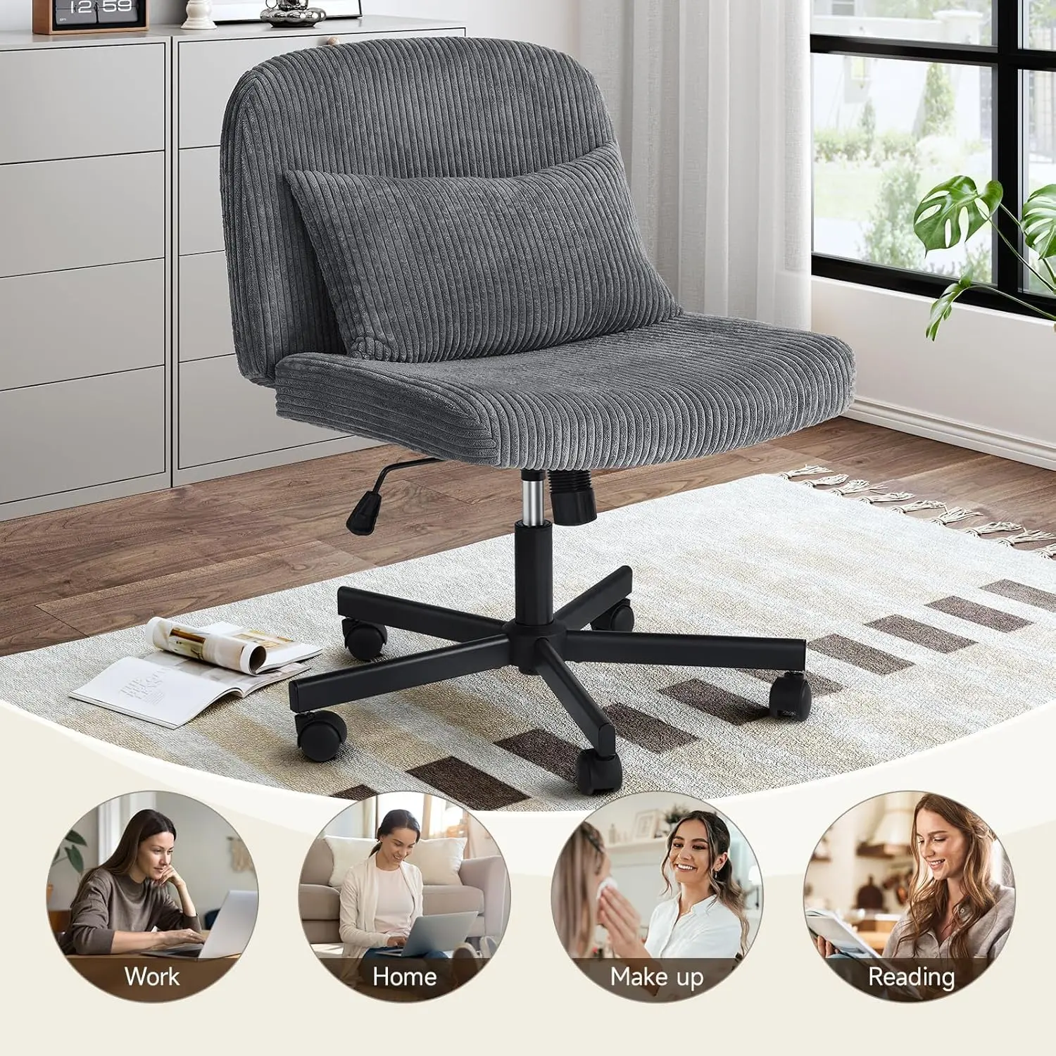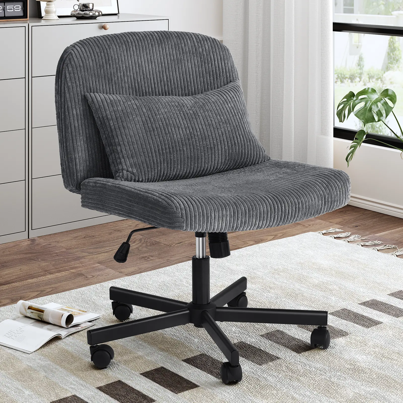 ·QUALITY MATERIAL: This grey criss cross chair with wheels is made of corduroy fabric, a metal bracket, a gas lift cylinder certified by BIFMA and SGS, can support 300lbs, and is sturdy and reliable. The wheels are smooth and you can move it as you like