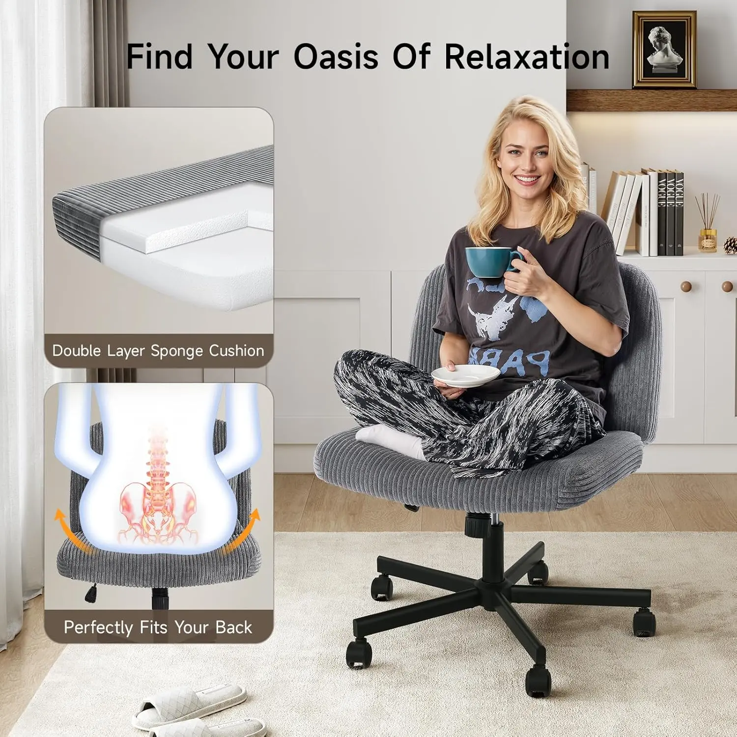 ·EASY TO ASSEMBLE: Say goodbye to the complicated installation process. This grey cross legged office chair with wheels is designed to be easy to assemble, comes with instructions, and you can easily assemble it in your office or home in just 20 minutes