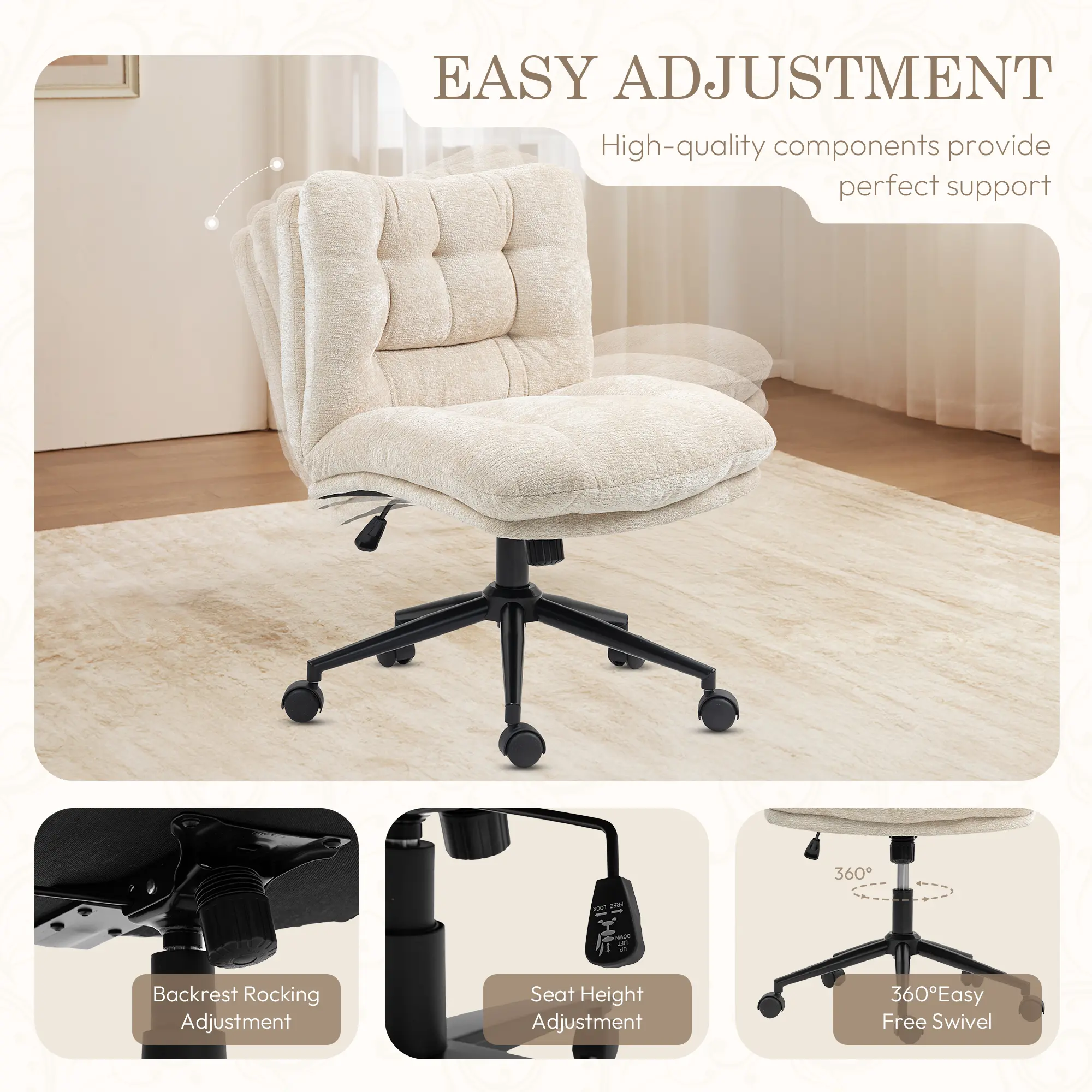 ·[Free Adjustment] This comfy chair for women comes with various fu[Luxurious Comfort] Soft seating is the epitome of a comfortable experience. Meticulously crafted with high resilience multi-layer foam padding and premium fabric, this criss cross desk chair provides long-lasting resilient support without collapsing. The wider and thicker vanity seat with high backrest can adapt to different sitting postures, especially for cross-legged, bringing you a sofa-like wrapping feeling, making it more flexible to sit in comfort.