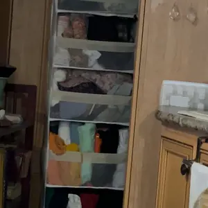 We used this for sweatshirt storage for my 12 year old. Rolled, it holds 2 per pocket. We love it!