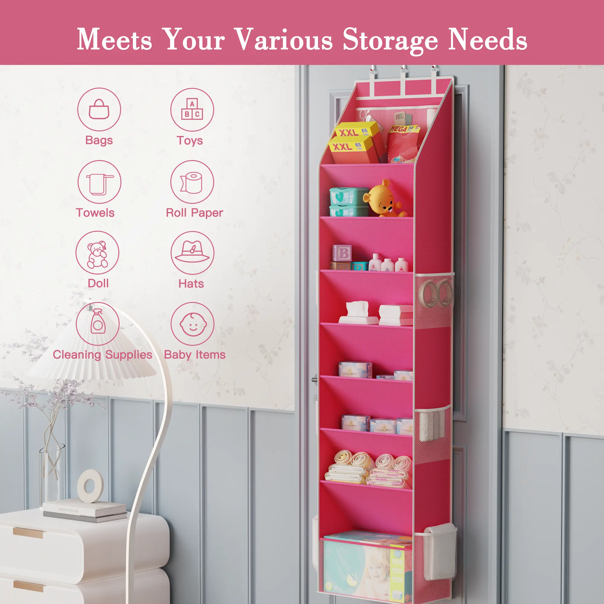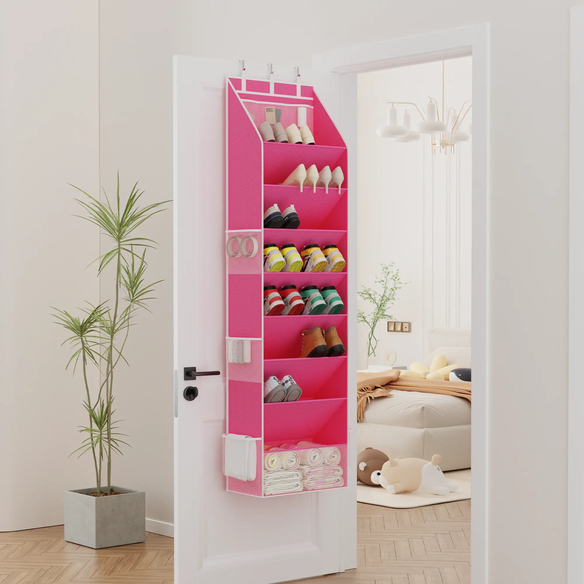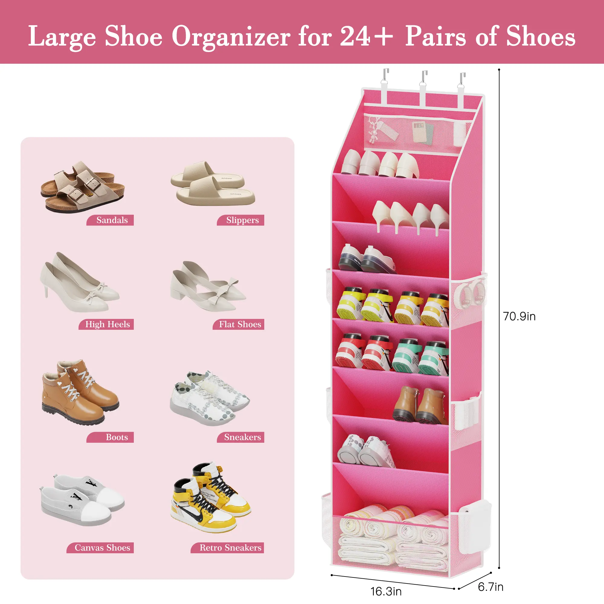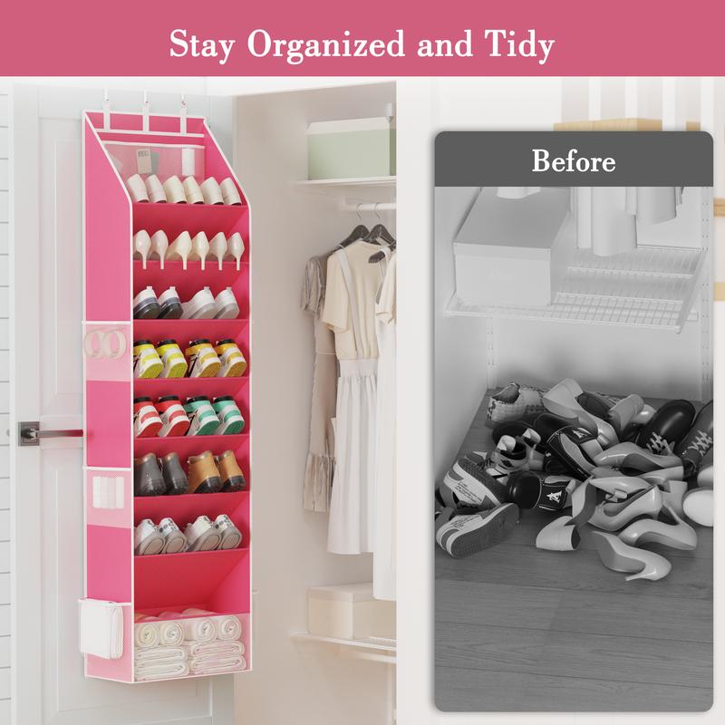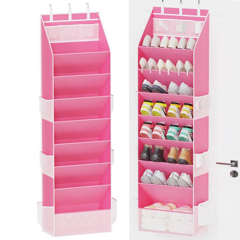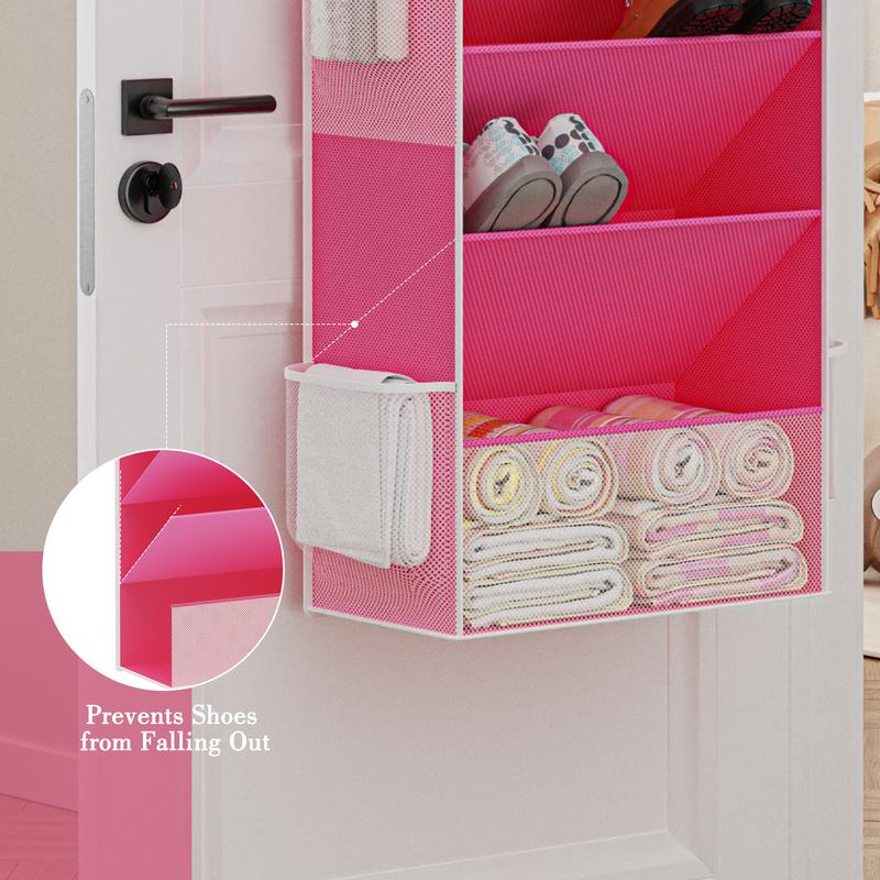 Both sides are closed to keep shoes secure. It includes 4 heavy-duty metal hooks for versatile door storage. Nail it directly on the wall for additional options. This organizer is a must-have for dormitory storage and back-to-school needs.