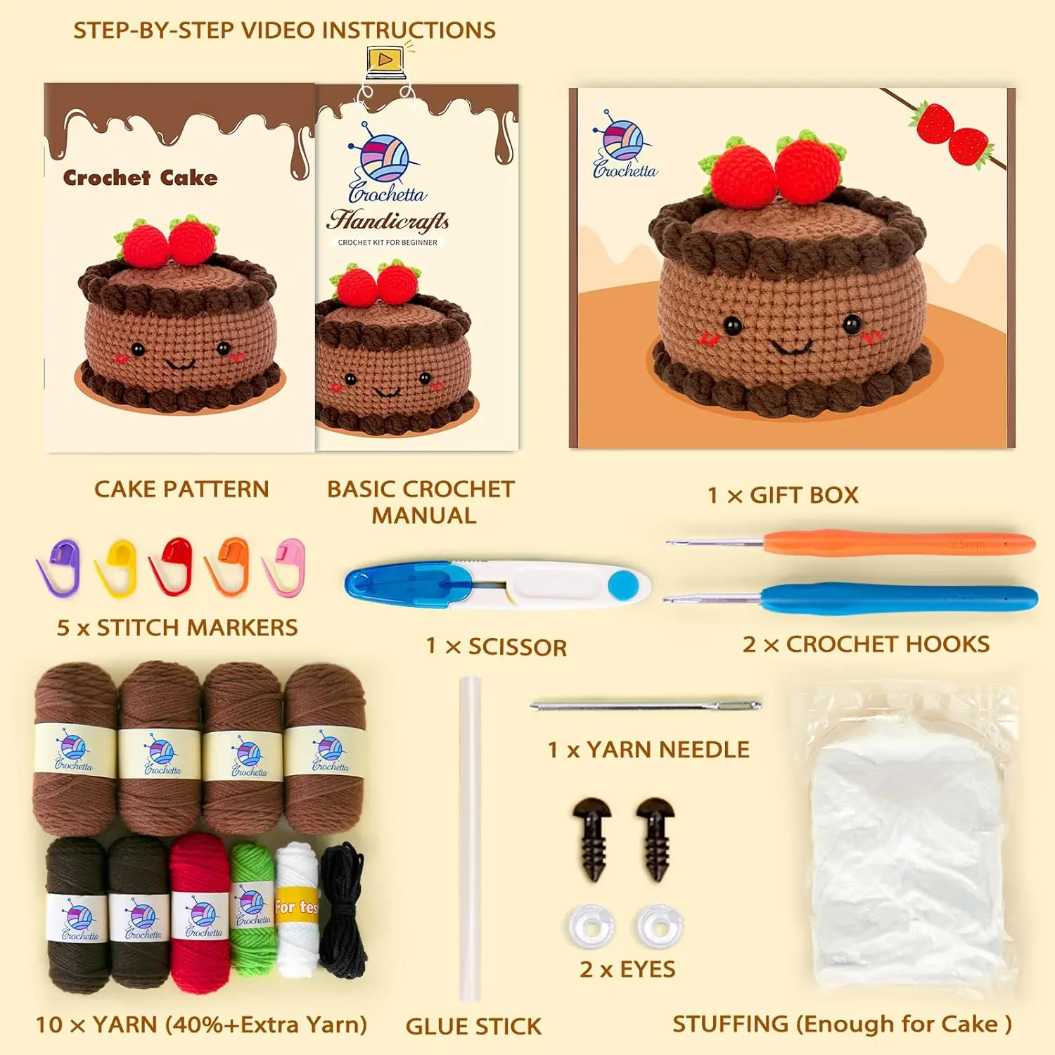·All-In-One Crochet Starter Kit: CROCHETTA beginner crochet kit includes everything you need to start: 10 different yarns bundle, ample stuffing, 1 needle, 2 eyes, 5 stitch markers, 2 ergonomic crochet hooks, 1 pair of scissors, 1 crochet cake pattern manual, and 1 beginner's basic crochet manual.