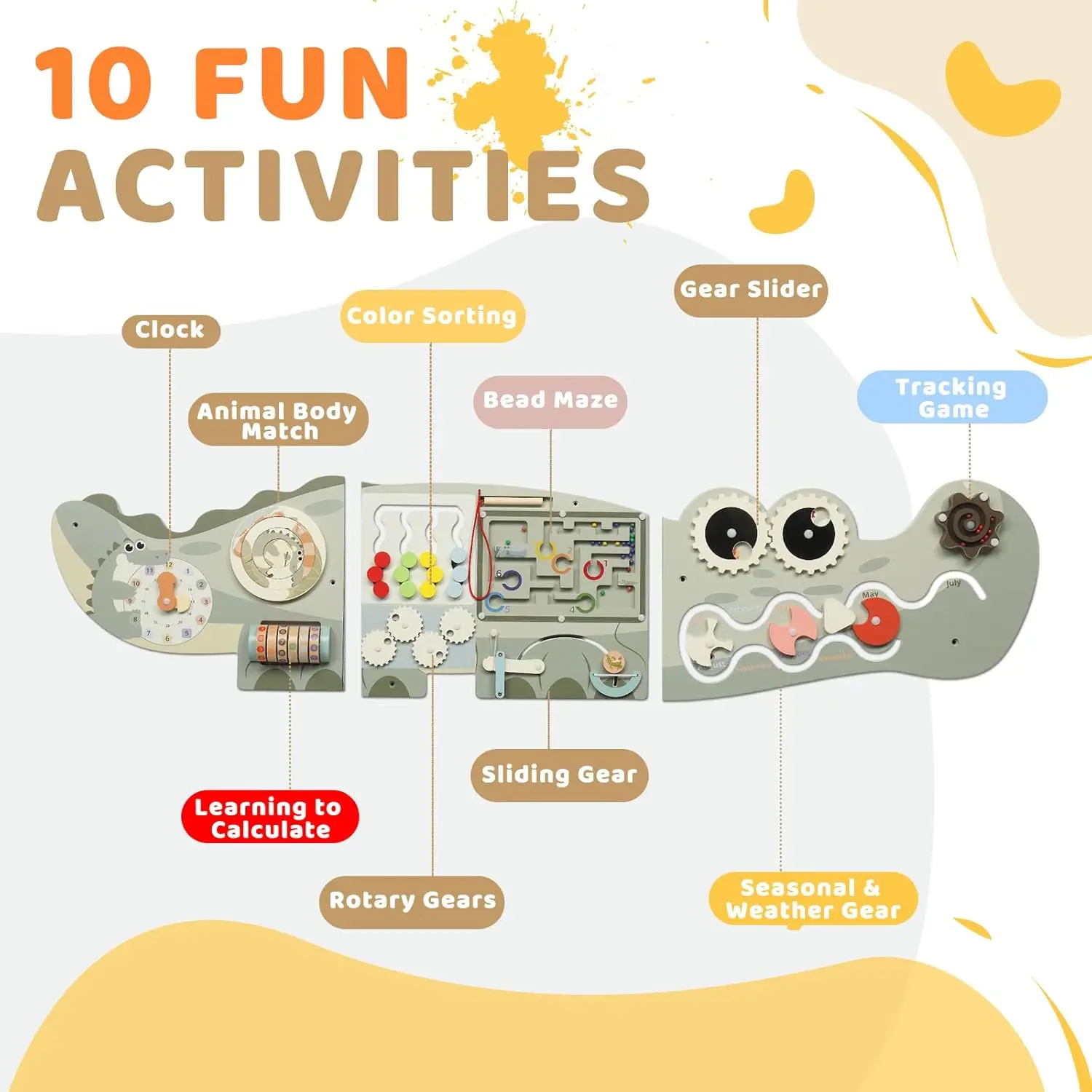 10-in-1 Sensory Learning Fun: The JOYMOR Crocodile Activity Wall features 10 engaging and interactive sensory panels, offering a wide range of activities that help toddlers improve motor skills, hand-eye coordination, and problem-solving abilities.