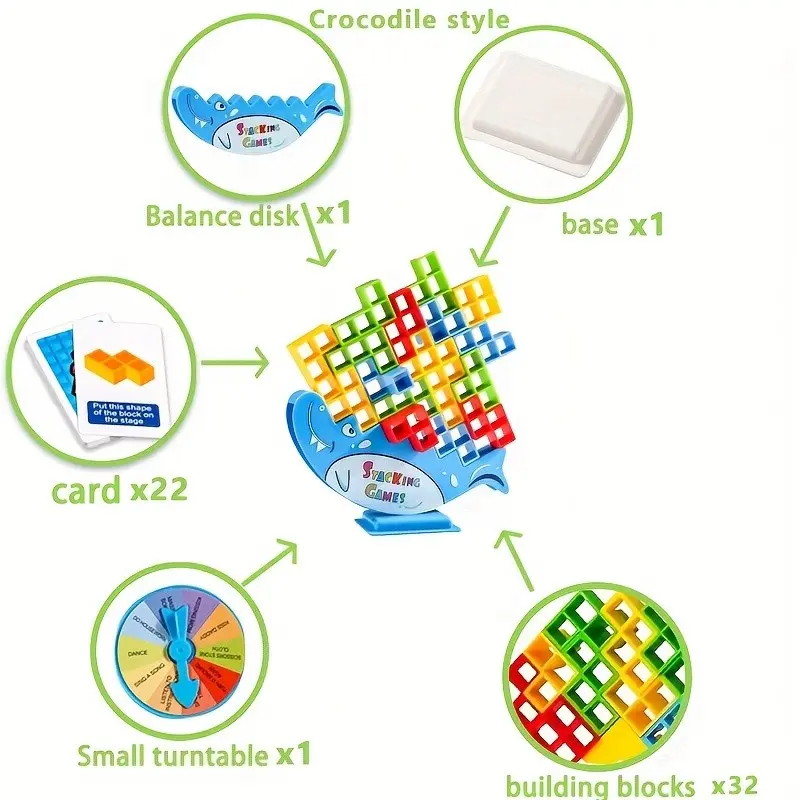 A set of crocodile stacking and attack games (including 57 accessories)/competitive cooperative stacking games with stable bases, suitable for family gatherings, outdoor camping, adult and family game nights, birthday parties, Christmas gifts