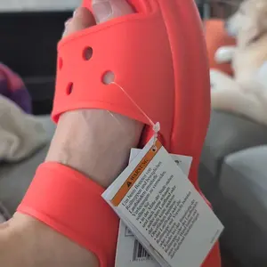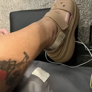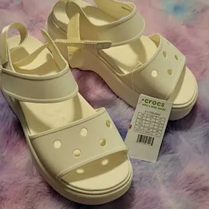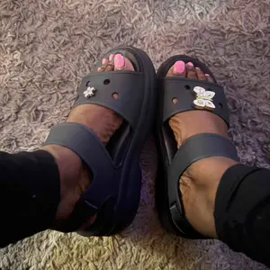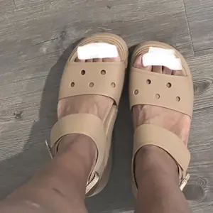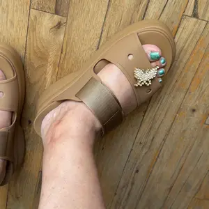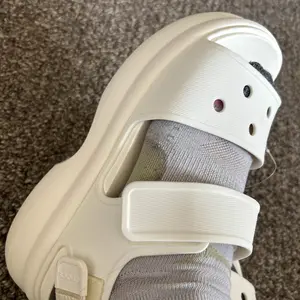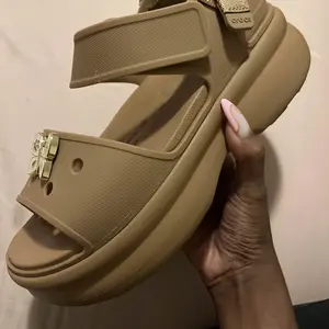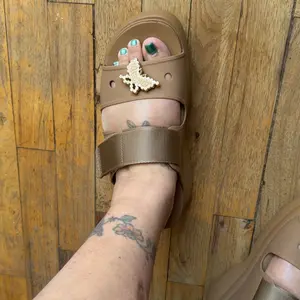 These are so so so comfy. The souls are super squishy! Love the camel color. And it came with a pretty metal croc charm. Love that! Super excited about this pair. Both straps are adjustable.