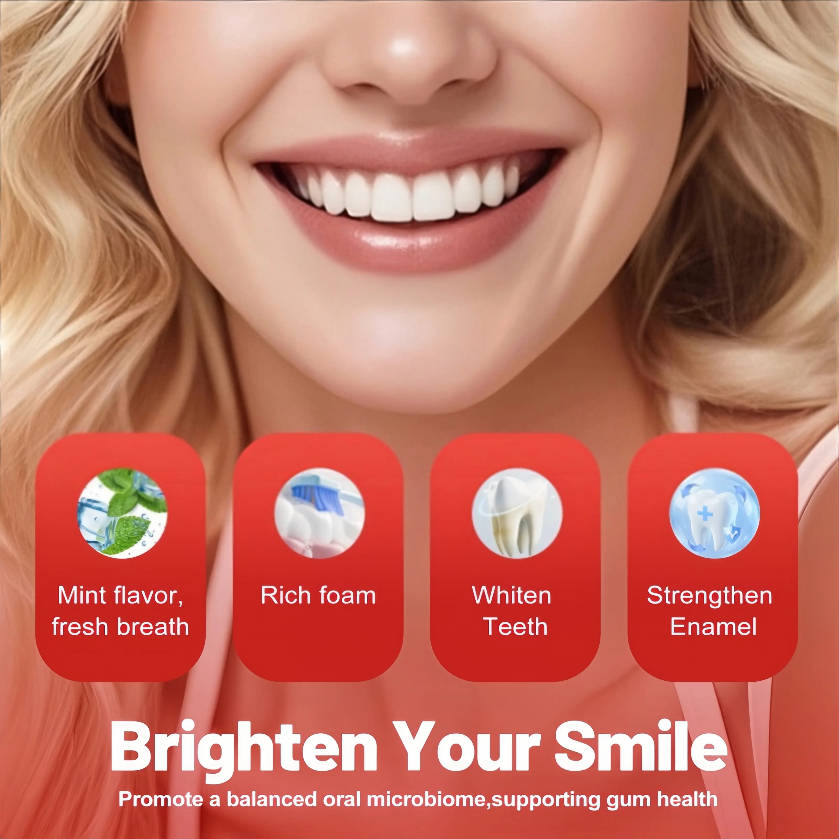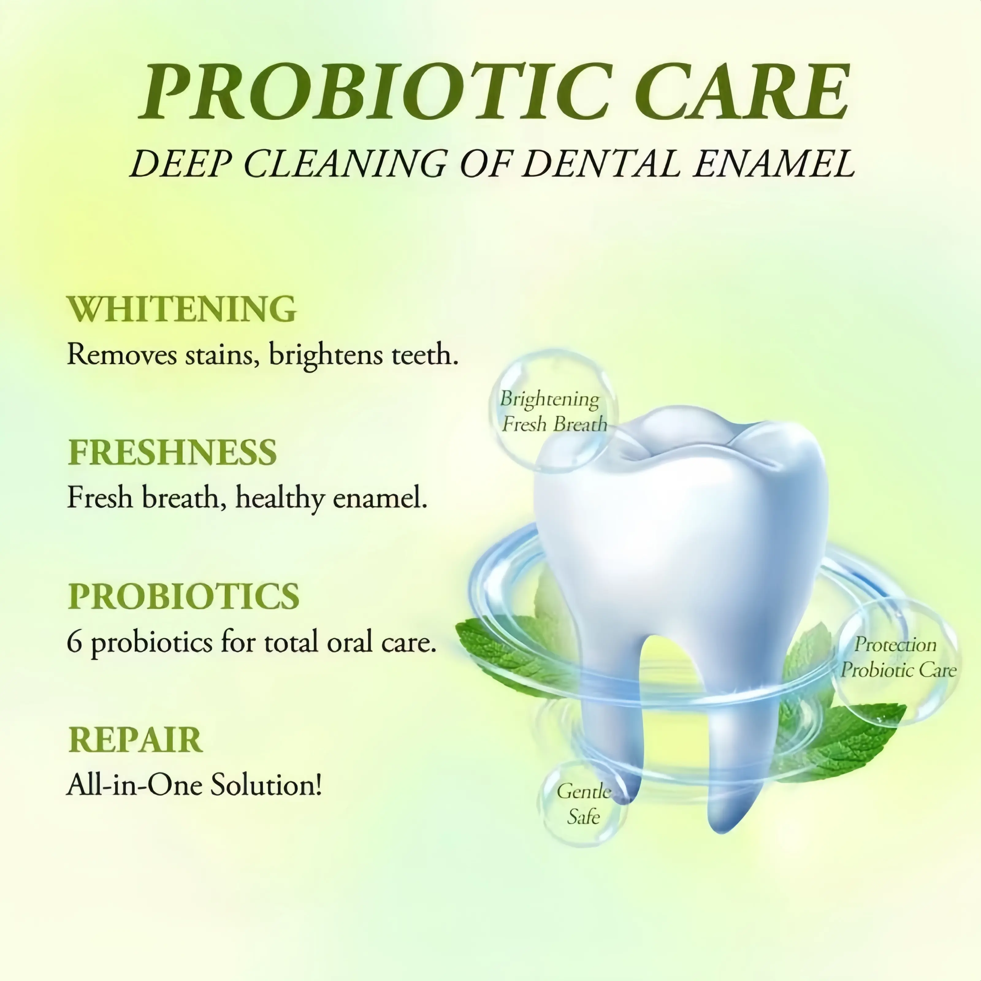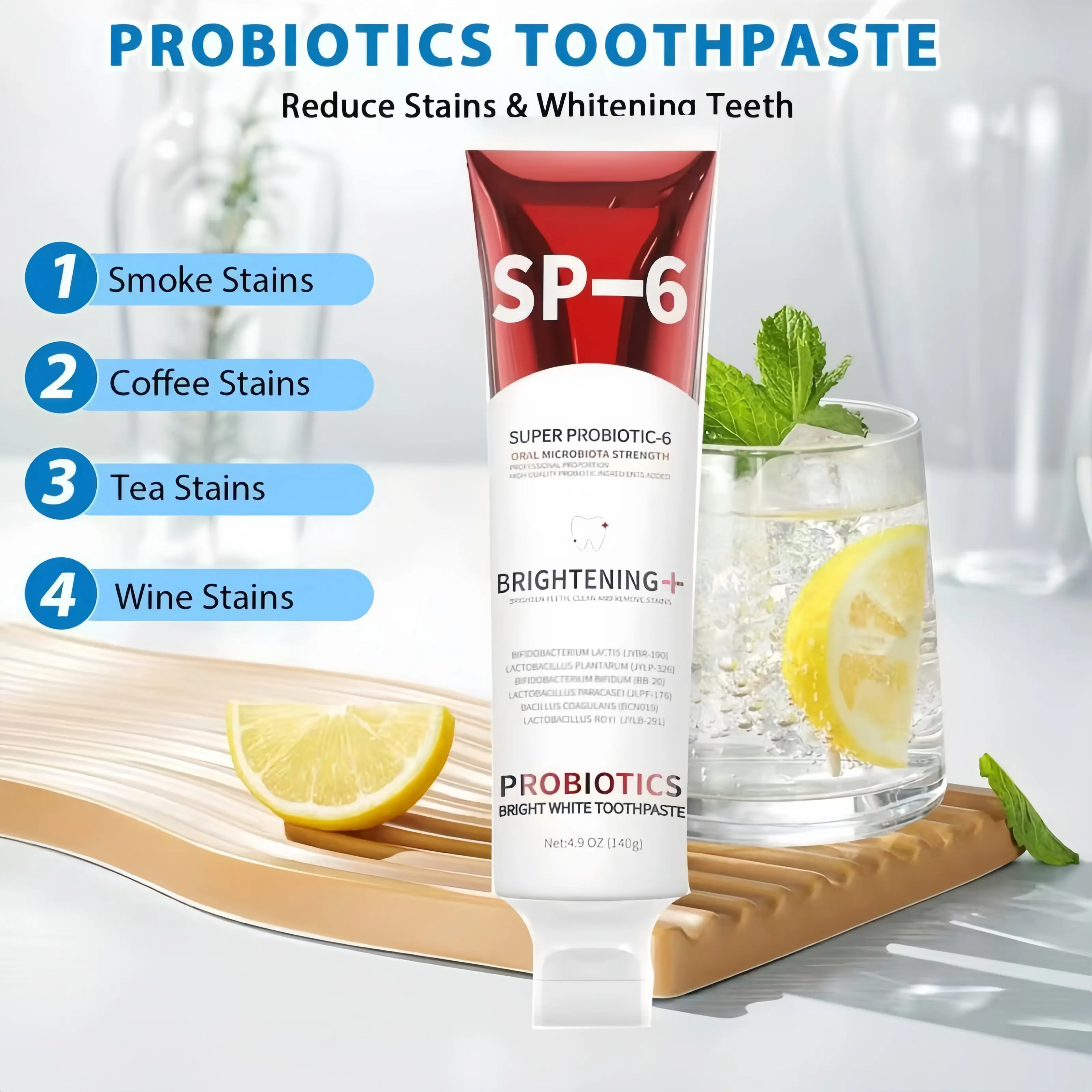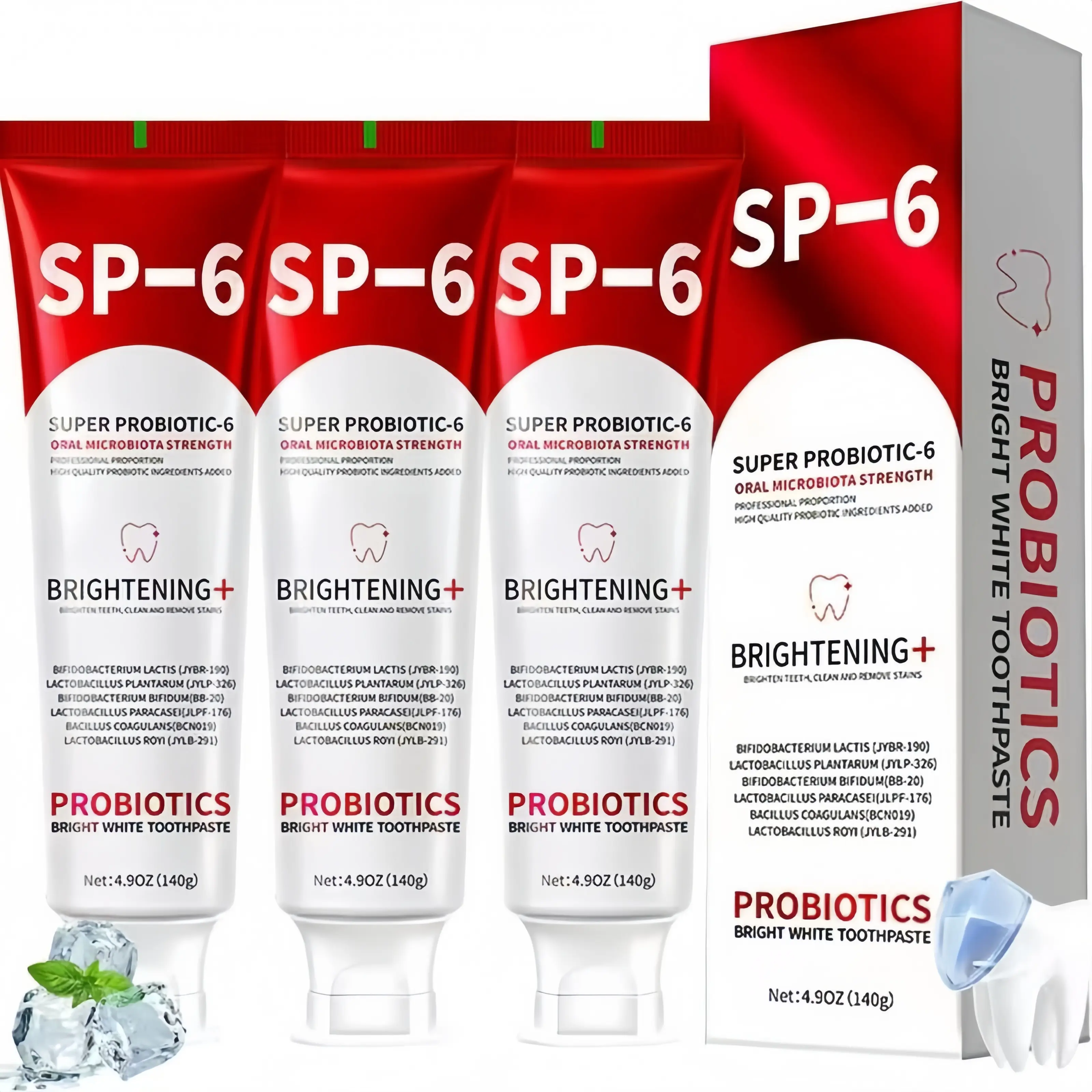 【6 Probiotics for Oral Health】: Our SP-6 Probiotic WhiteningToothpaste contains a unique blend of six probiotics topromote a balanced oral microbiome. These probiotics helpfight bad breath, reduce plaque, and enhance your gum healthfor a fresher, cleaner smile with every use.