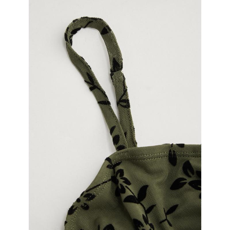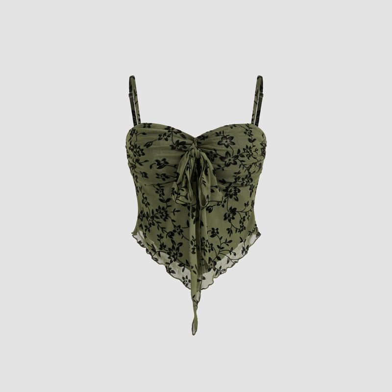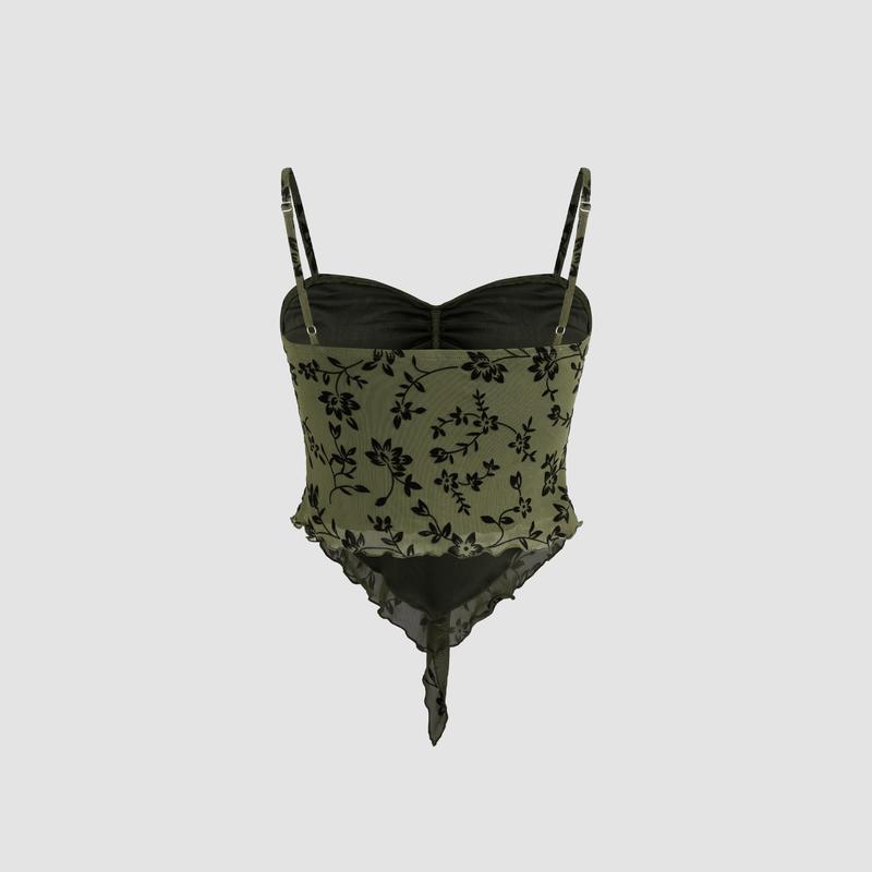 5. Cider [2 colors, size 2-26] Mesh V-neck Floral Lettuce Trim Knotted Crop Cami Top