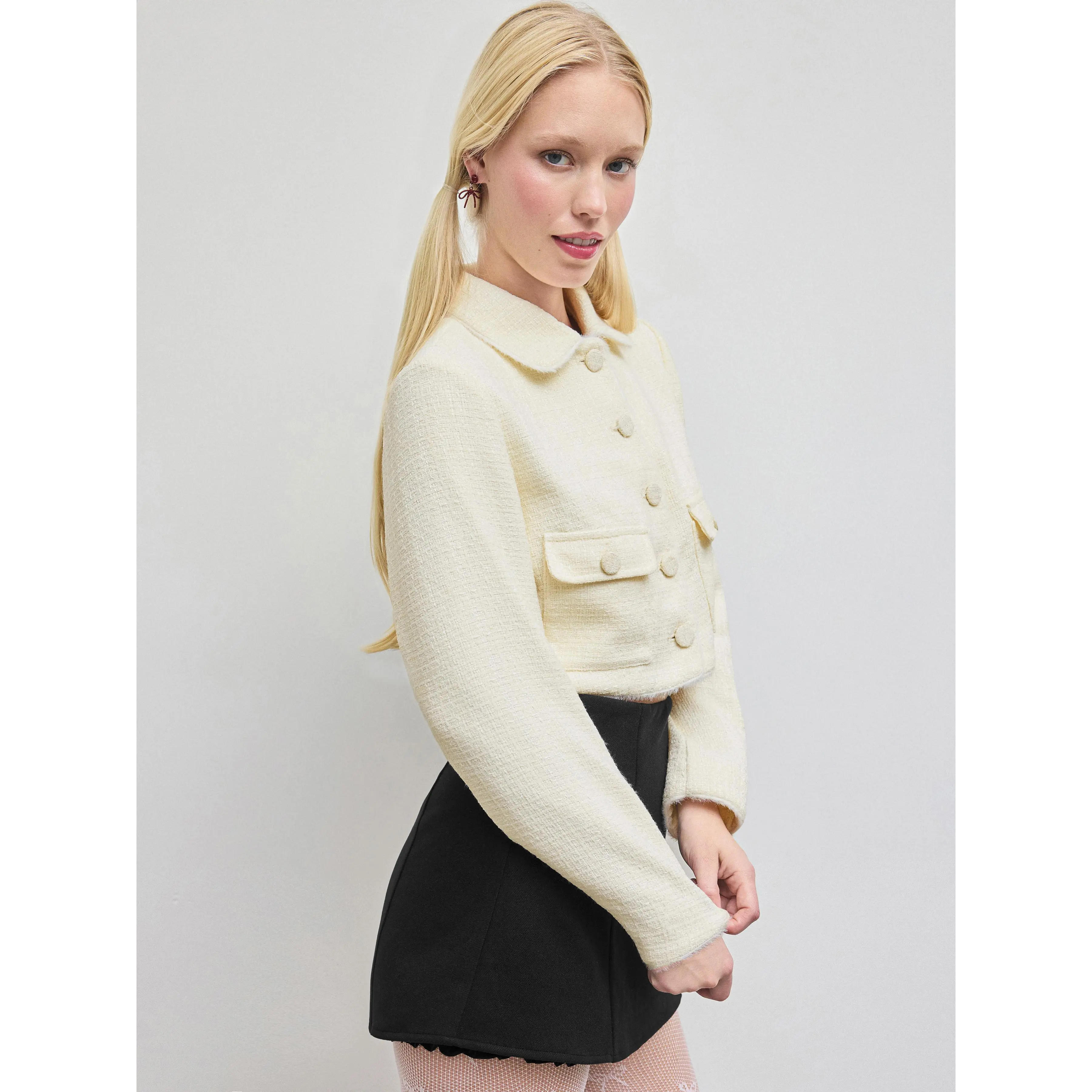 5. Cider [size 2-10] Tweed Collar Solid Button Pocket Crop Jacket