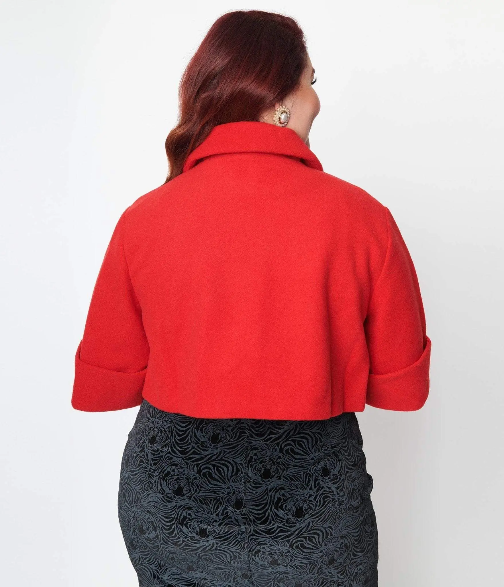 This gorgeous crop length jacket is crafted in a bright red brushed wool fabric, and boasts a button at the collar, and three quarter length sleeves! Available in sizes S-4X while supplies last.