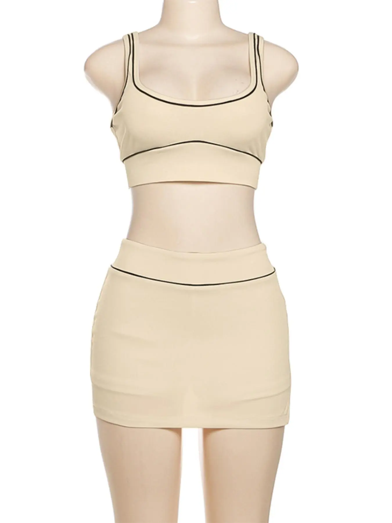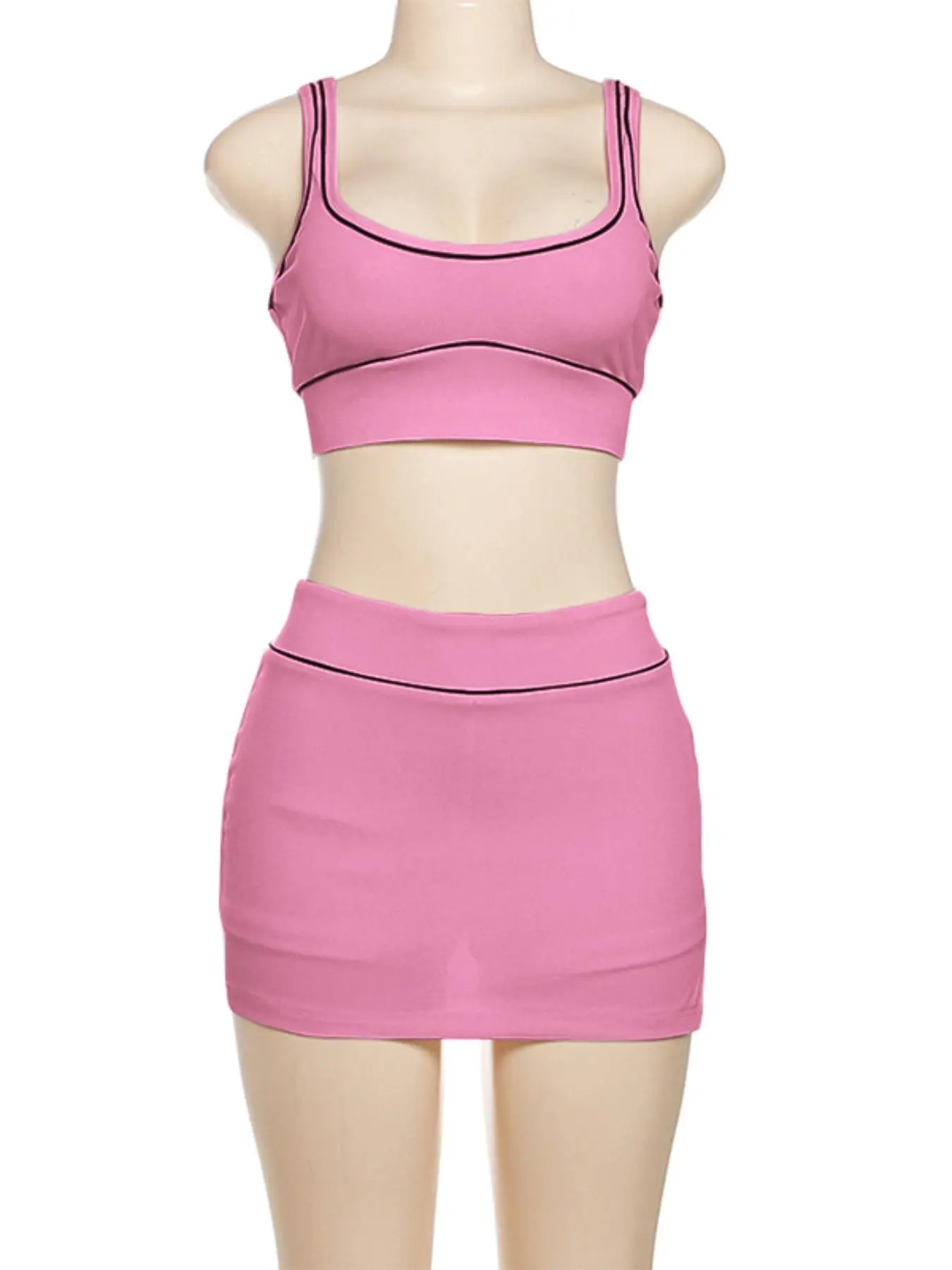 Product is see through and not the best material. Definitely not work out material. Runs small. The top is more like a bra less than a cropped tank top. skirt is very short but has shorts under. has a slit but only on 1 side. Still cute.