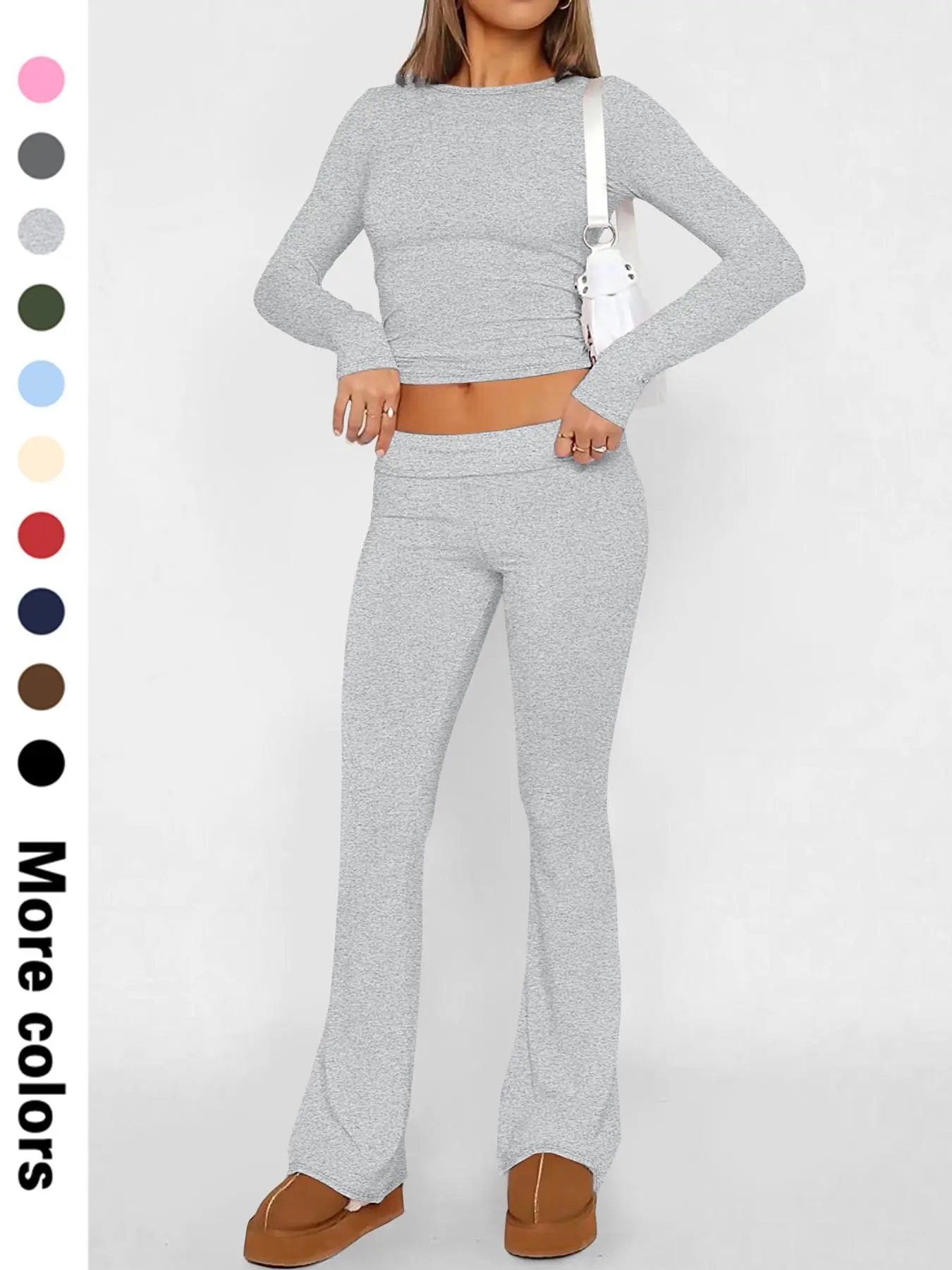 Two-Piece Set Women's Solid Color Long Sleeve Crop Tee & Flare Leg Pants, Casual Fashion Cozy Round Neck Top & Bell Bottom Trousers for Daily Outdoor Wear, Women's Clothing for Fall & Winter