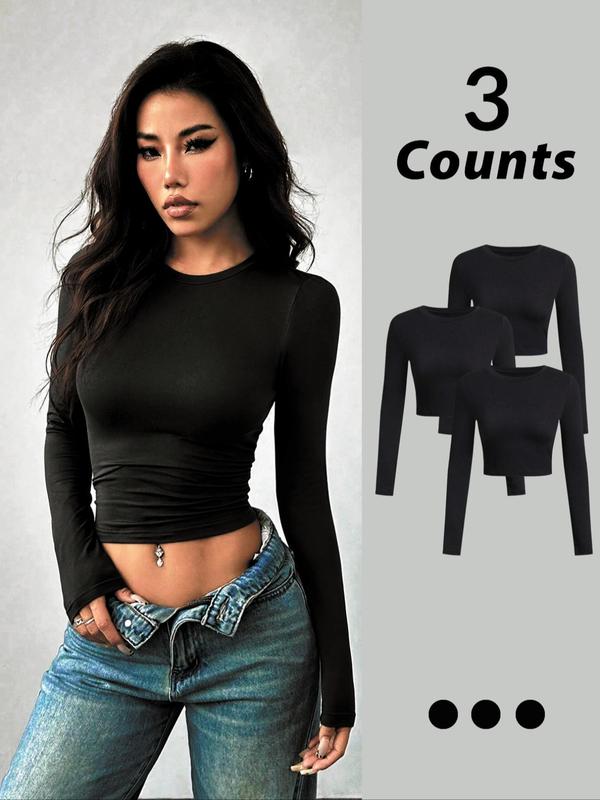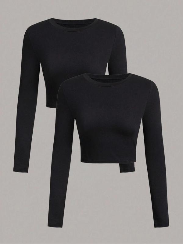 5. Women's Solid Long Sleeve Round Neck Crop Tee, Casual Crew Neck T-shirt for Daily Wear, Ladies Clothes for All Seasons, Casual Fashionable Top