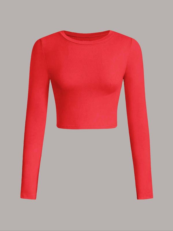 Women's Solid Long Sleeve Round Neck Crop Tee, Casual Crew Neck T-Shirt for Daily Wear, Ladies Clothes for All Seasons #crewneck #falltops #croppedsweater #activewearforwomen #womensclothingtiktokshop #oversizedtop #croppedtee #womenssweatshirtset #shapeweartanktop #rudolphcrewneck
