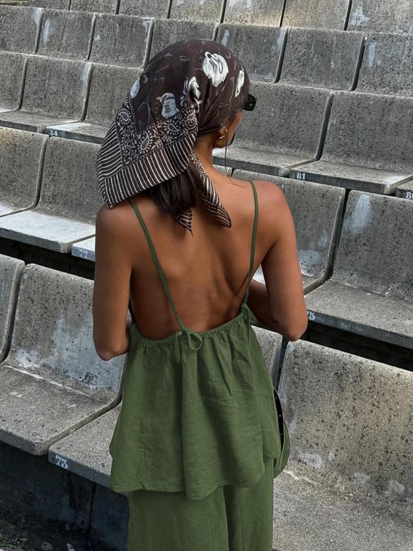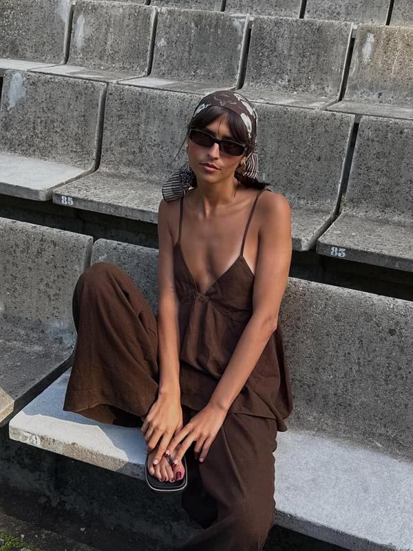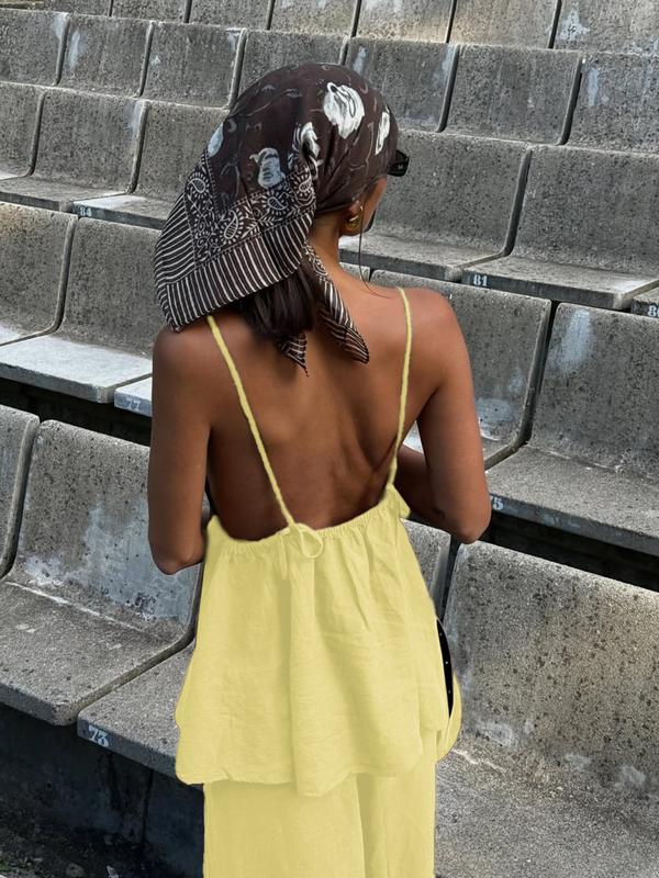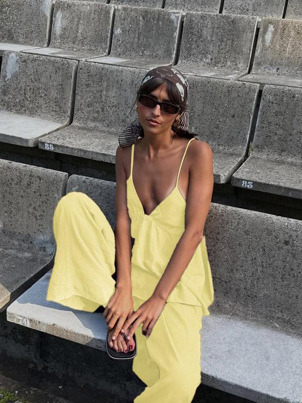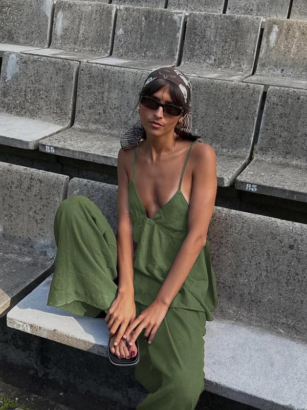 5. Fashion Casual Vacation Style Deep V Backless Crop Top and Wide Leg Pants Set, Sleeveless Fitted H-Type, Long Regular Length, Natural Waist