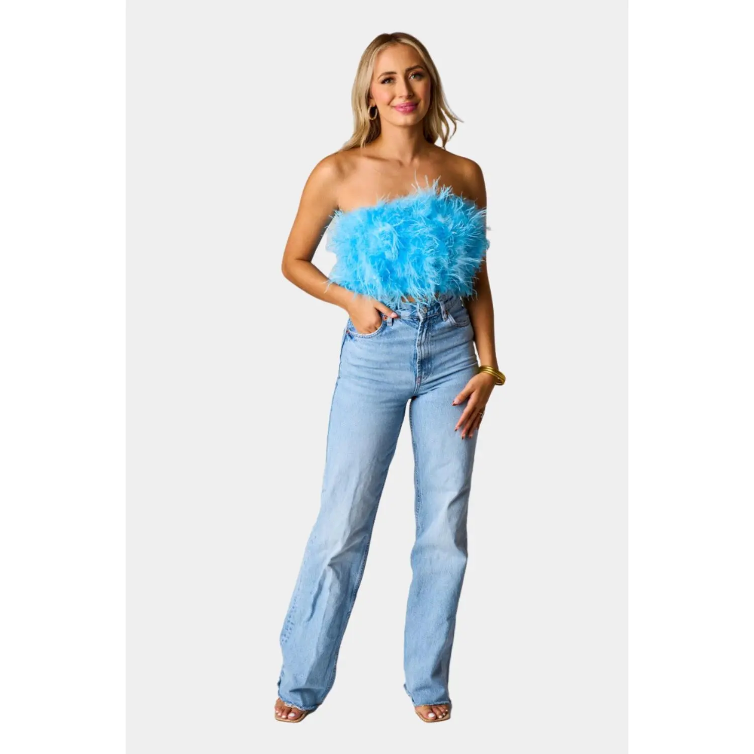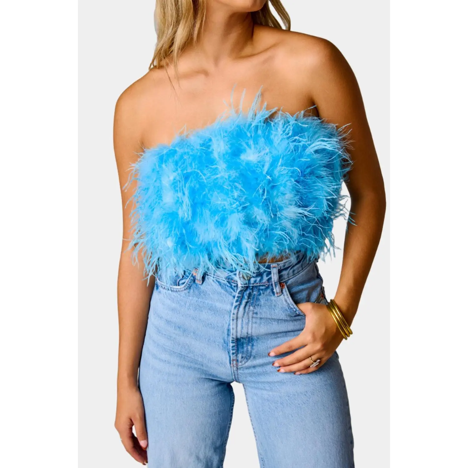 Now this is a statement top! She is sure to be your go-to top for all your events and parties this season! Fancy features feather detailing and an elastic band with good stretch. We love her styled with Travoltas and heels!