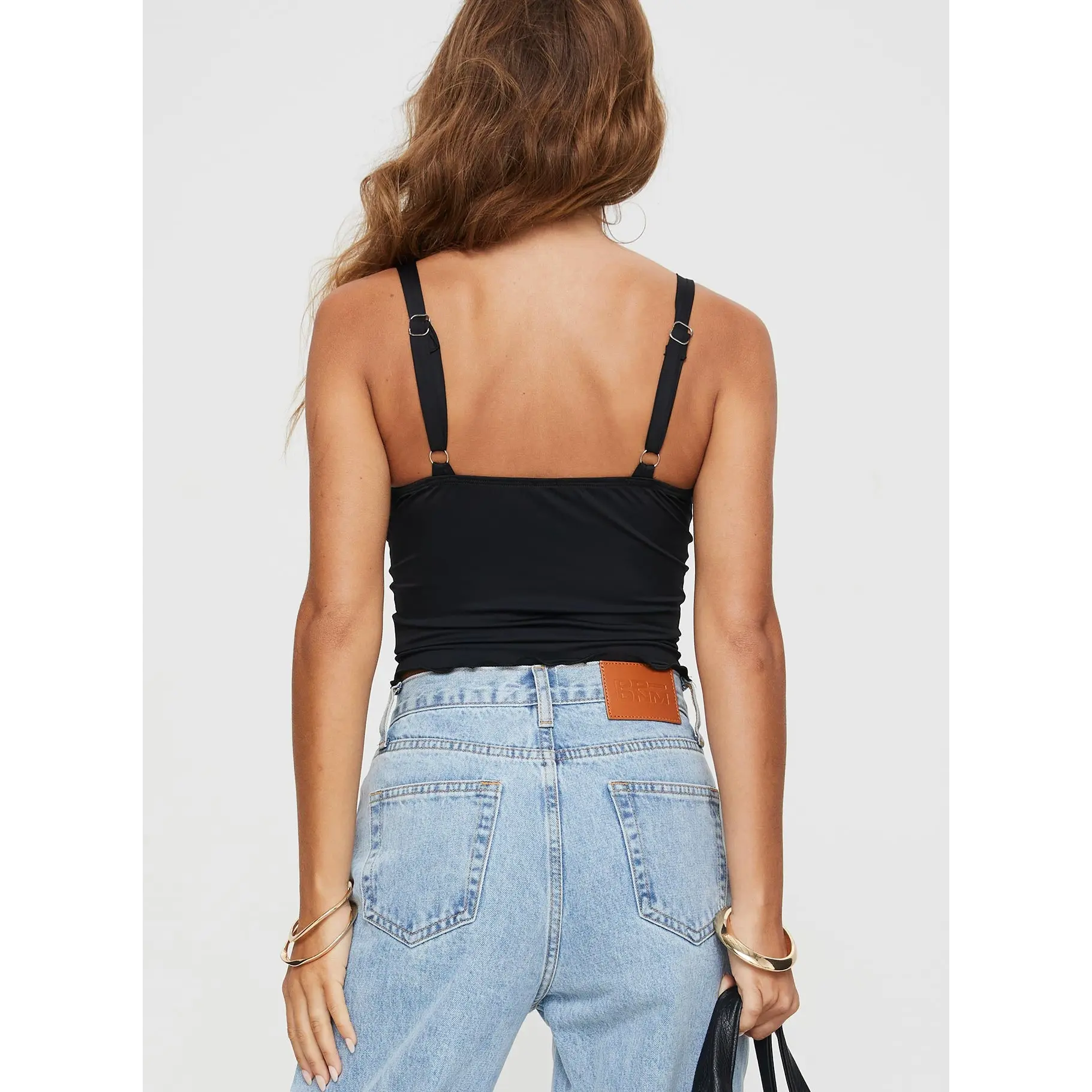 ·V neckline, adjustable straps, lettuce edge hem