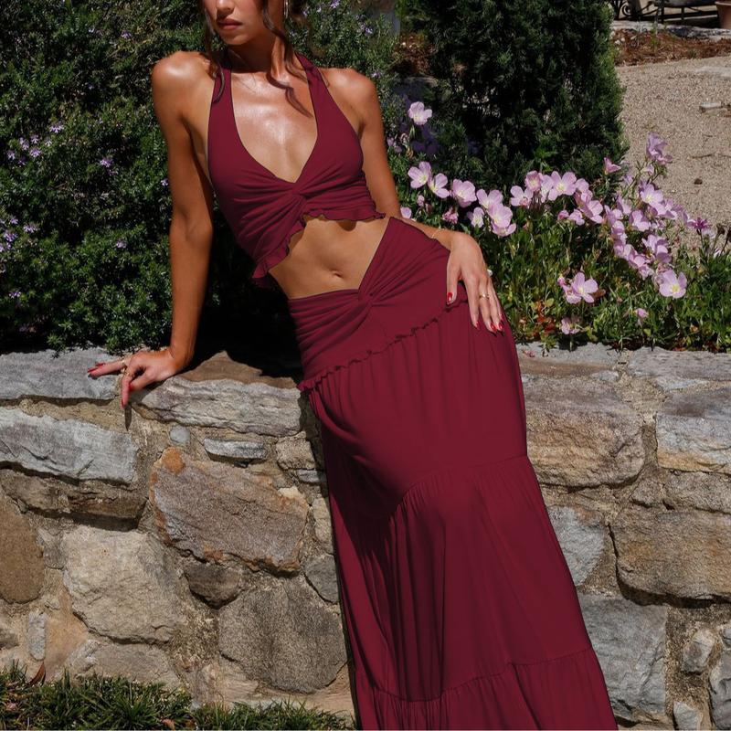 5. Solid Color Backless Crop Top & Ruched Skirt Two Pieces Set Women's Sleeveless Halter Neck Top & Skirt Ladies Summer Fall Clothes for Party Holiday Vacation Beach Boho Valentine's DayGift Outfit