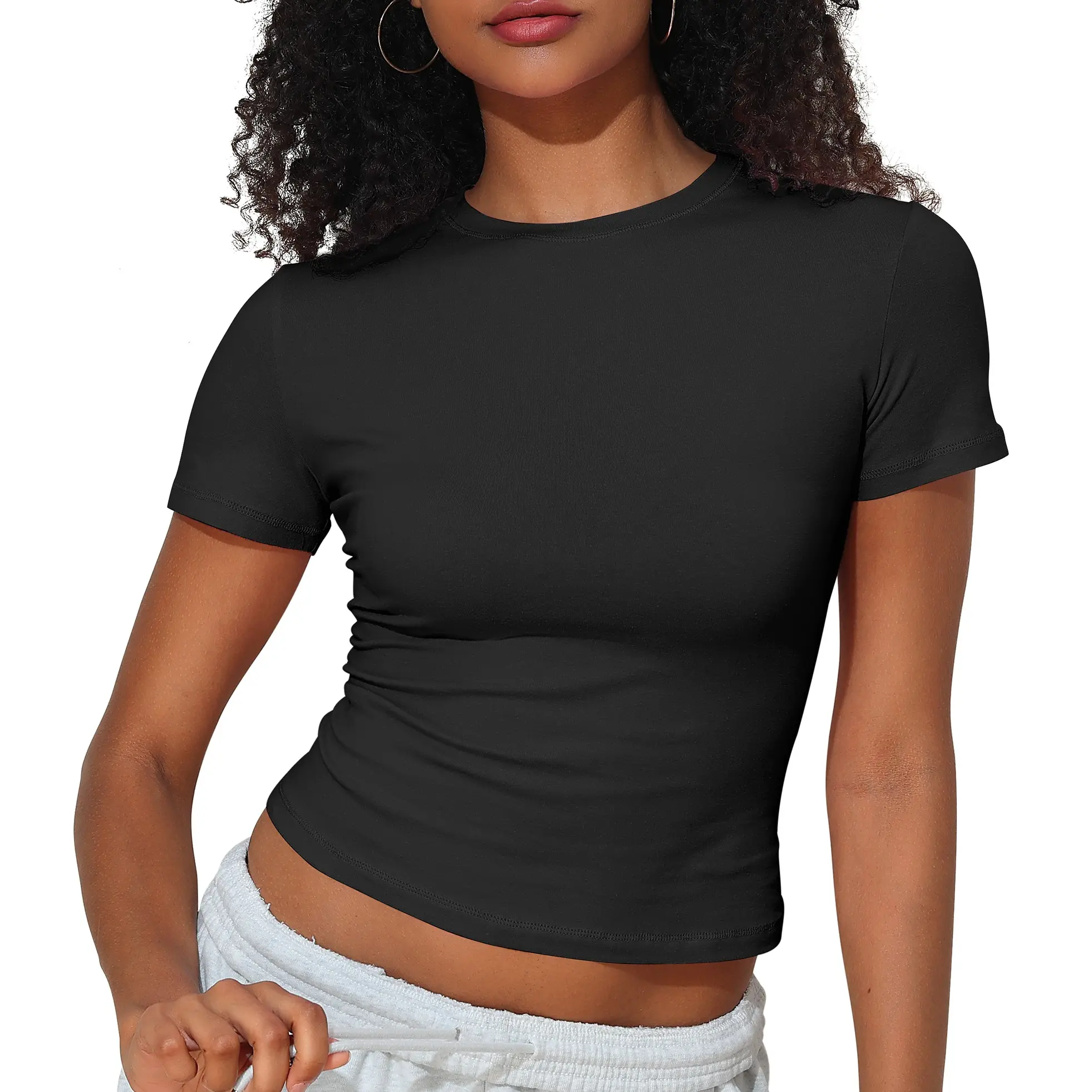 ·Chic Design: Basic crop T-shirt has a body-hugging fit with a round neckline. Its cute and tight fitted style adds a touch of casual elegance to your look
