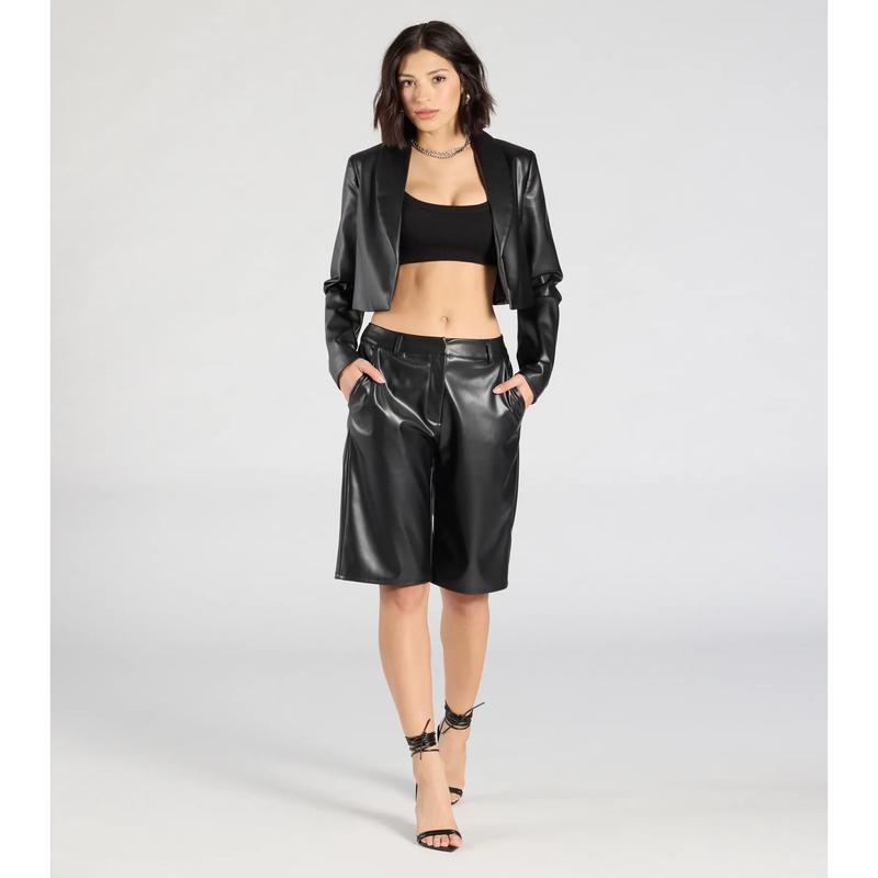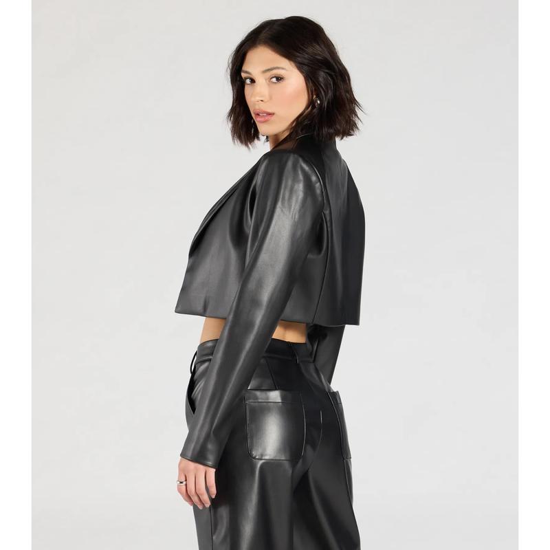 Layer on a chic vibe with this sleek faux leather cropped blazer. The cropped relaxed silhouette will give your 'fit that effortlessly cool look.