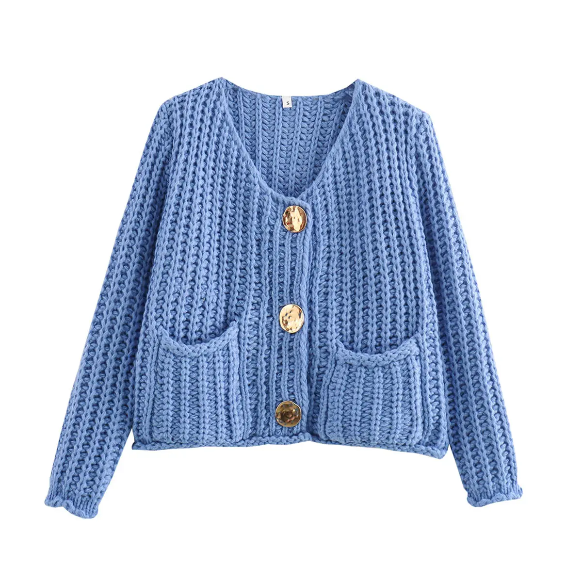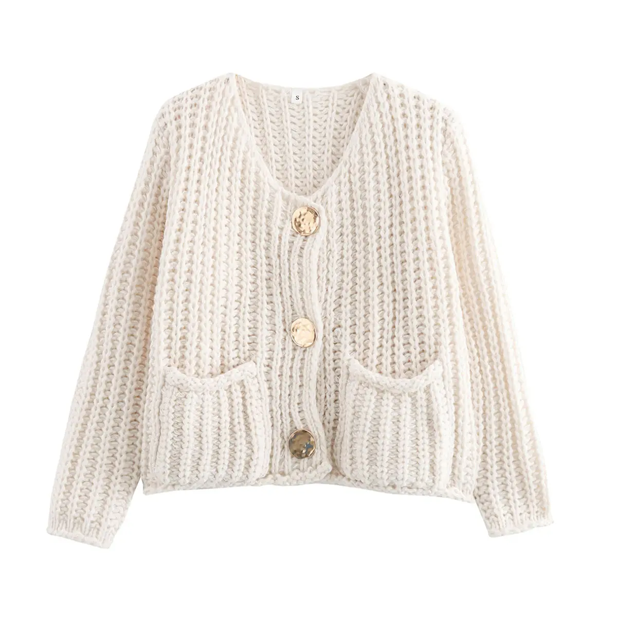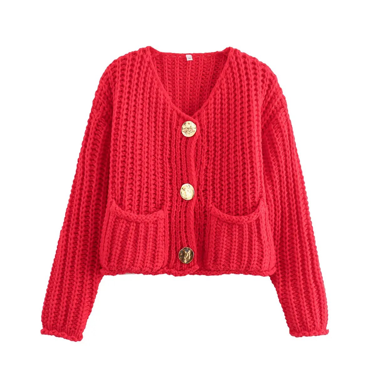 ·Feature: Vintage gold buttons front, two front pockets, cropped length, full sleeves, classical V neck, ribbed knit cuffs and hemline, chunky knitted design