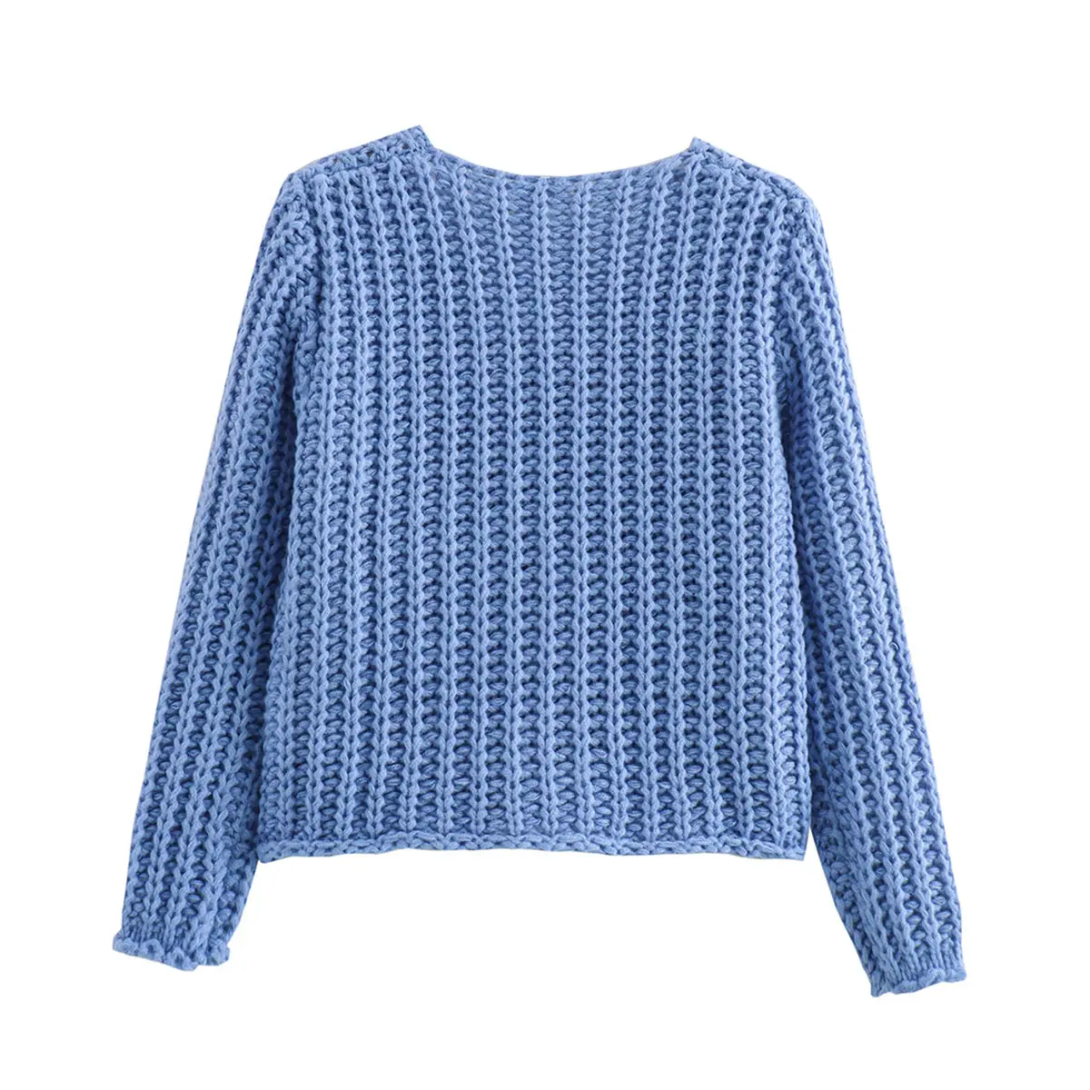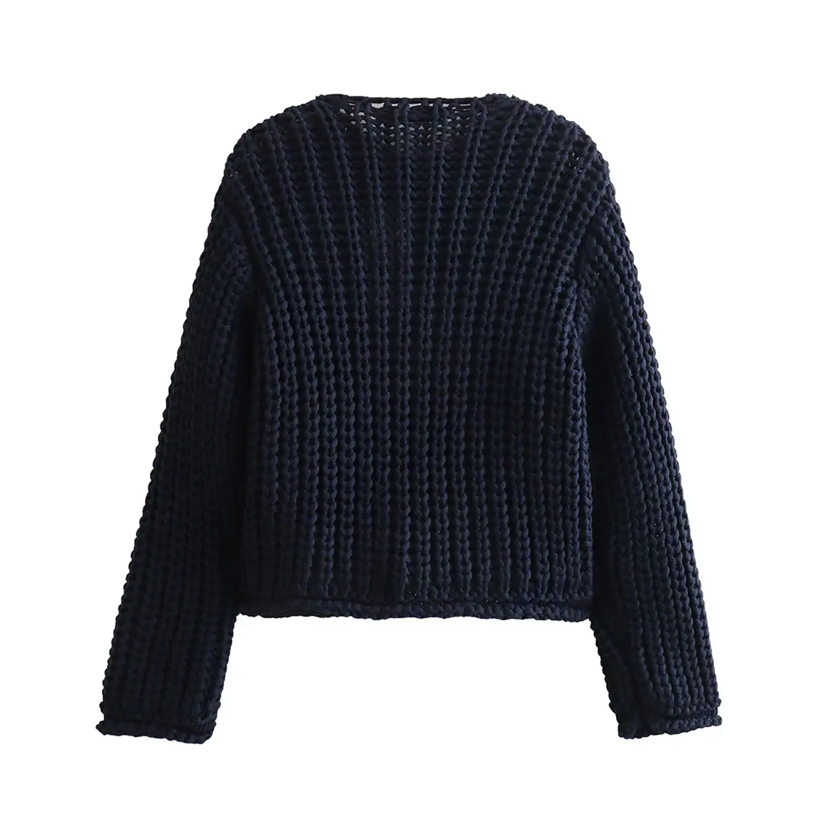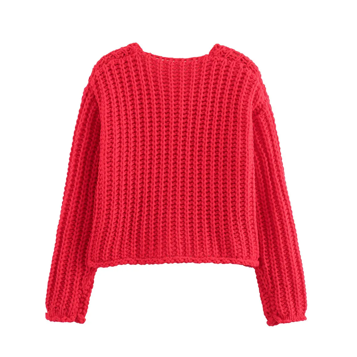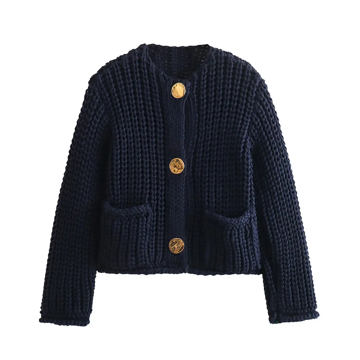 ·Feature: Vintage gold buttons front, two front pockets, cropped length, full sleeves, classical V neck, ribbed knit cuffs and hemline, chunky knitted design