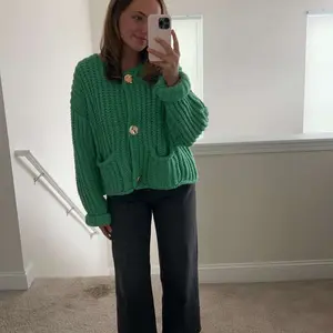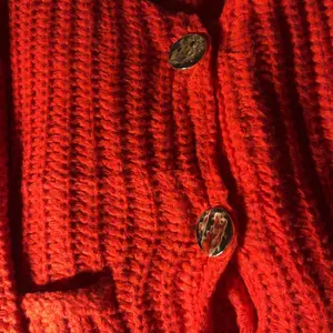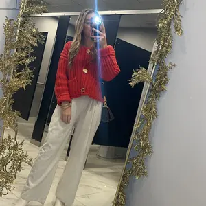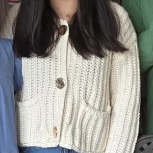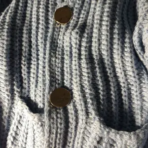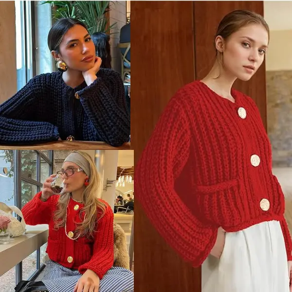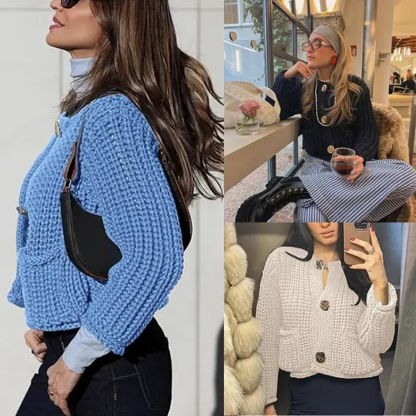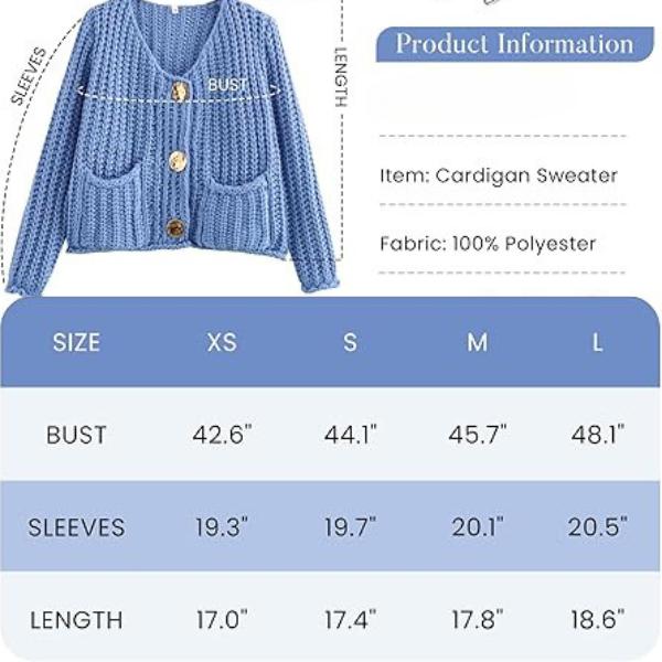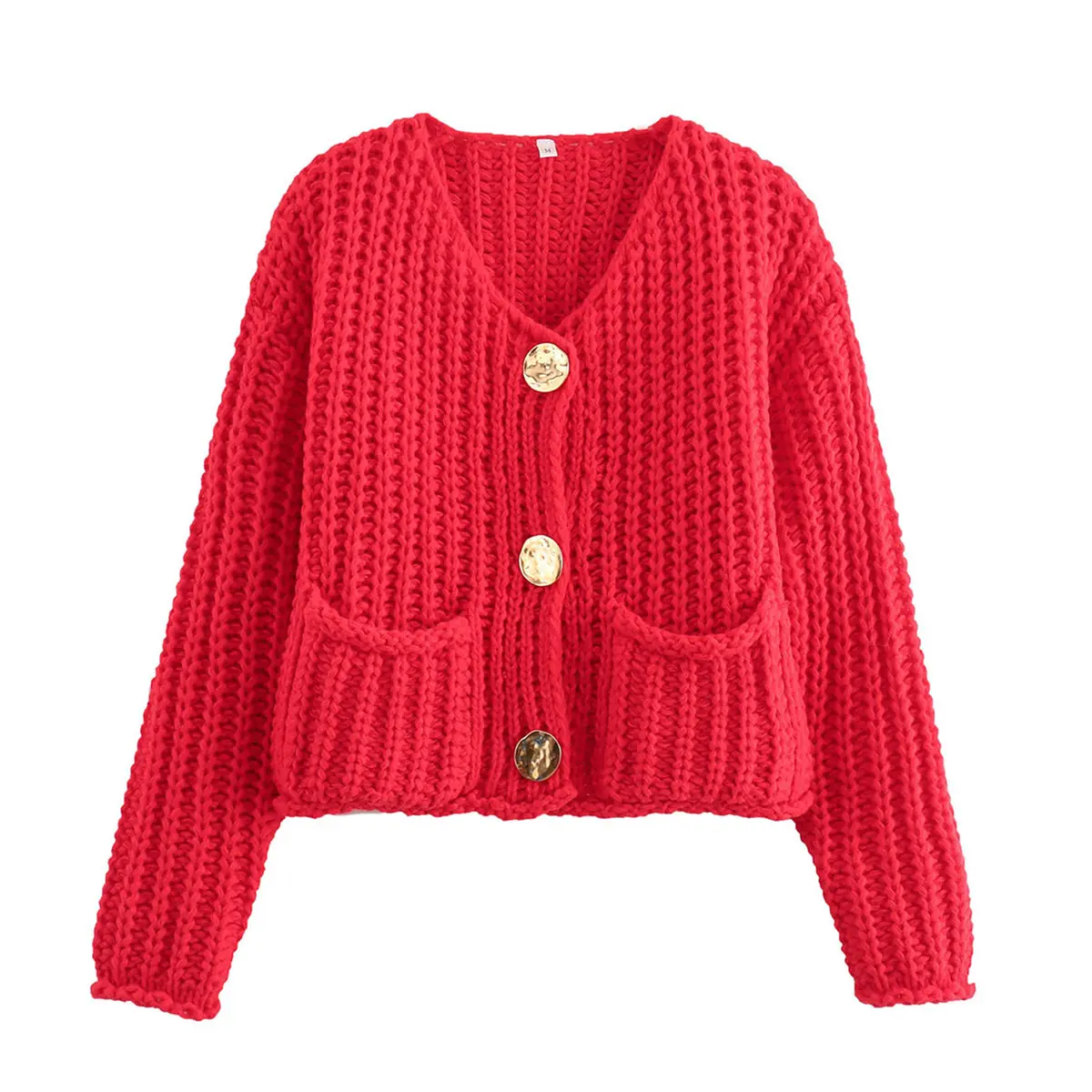 Feature: Vintage gold buttons front, two front pockets, cropped length, full sleeves, classical V neck, ribbed knit cuffs and hemline, chunky knitted design