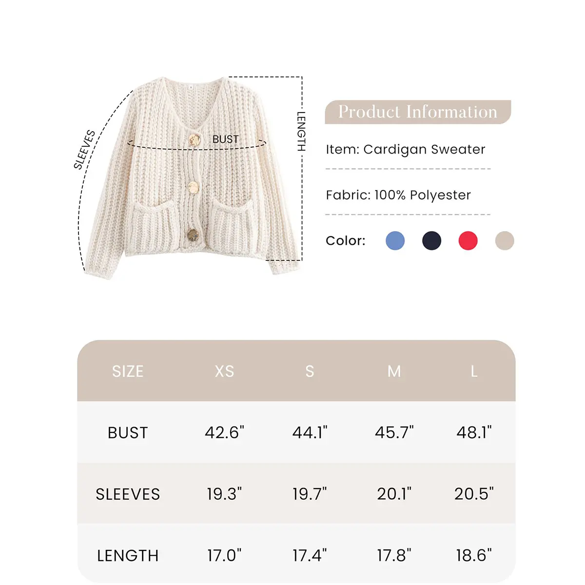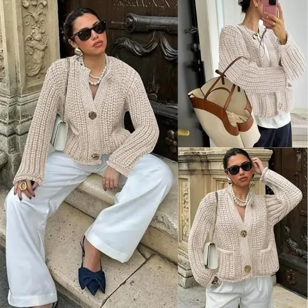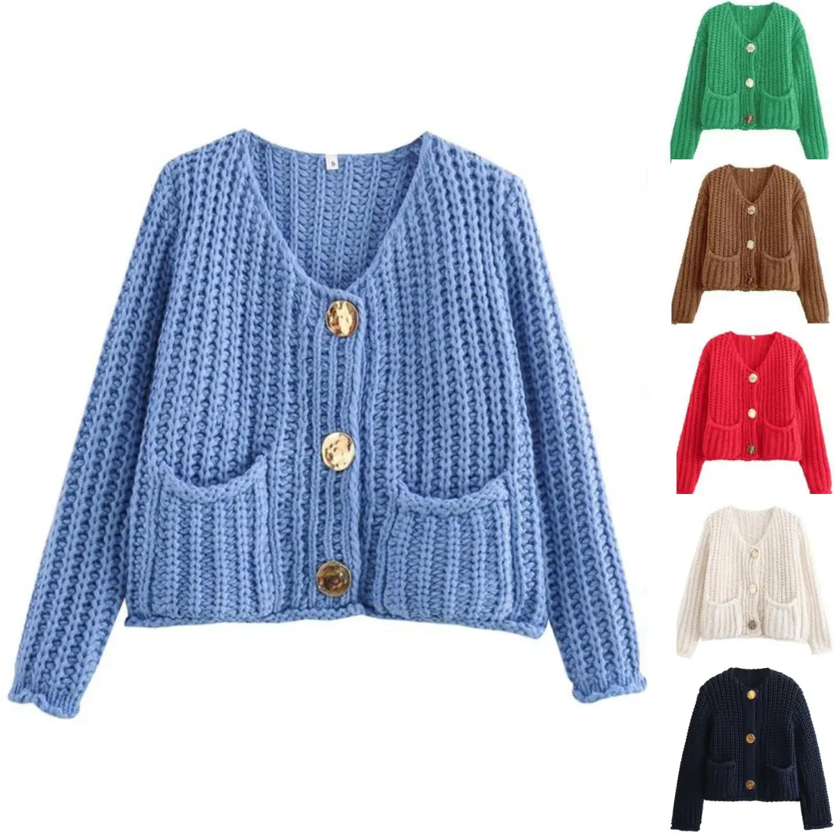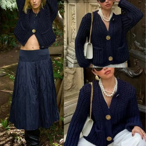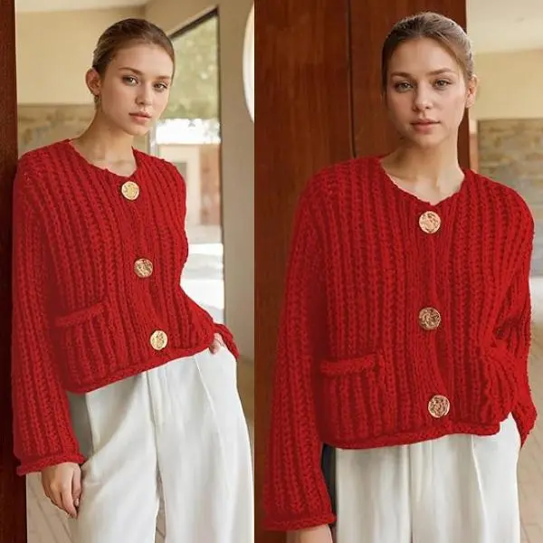·Feature: Vintage gold buttons front, two front pockets, cropped length, full sleeves, classical V neck, ribbed knit cuffs and hemline, chunky knitted design