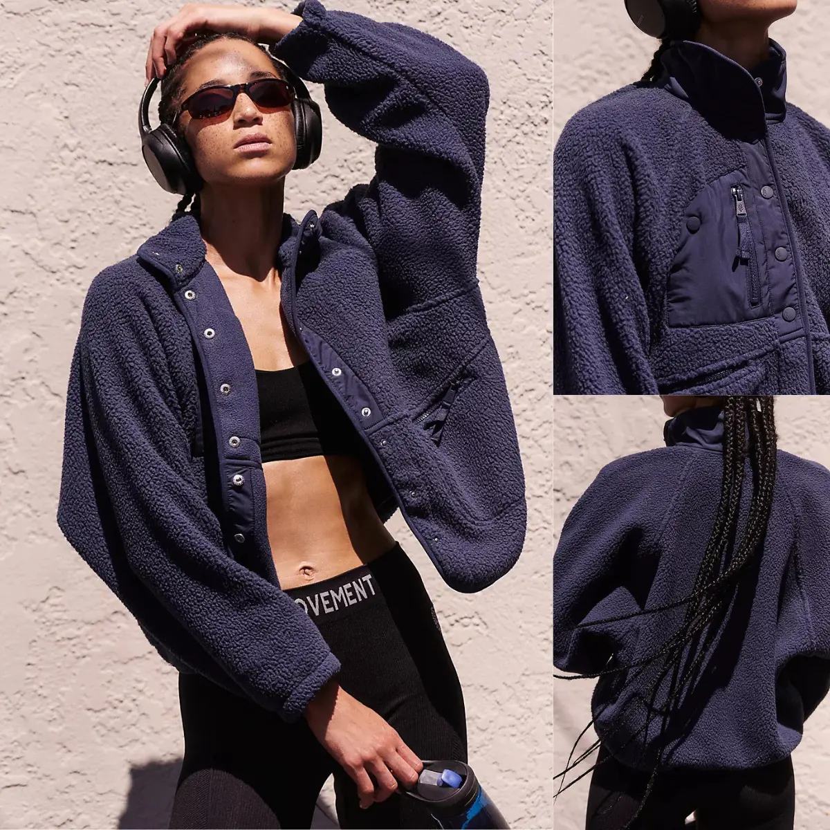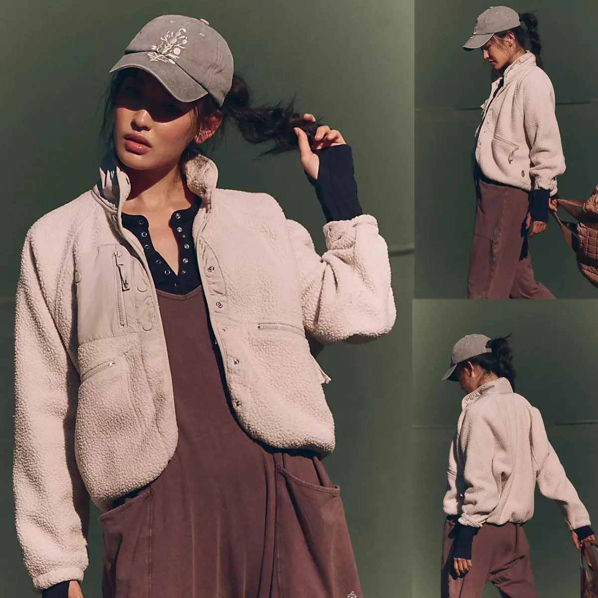 I love how cozy this jacket is, the fleece is really soft on the inside while the outside texture is wooly. TheFP one collects hair really bad, this one is great.