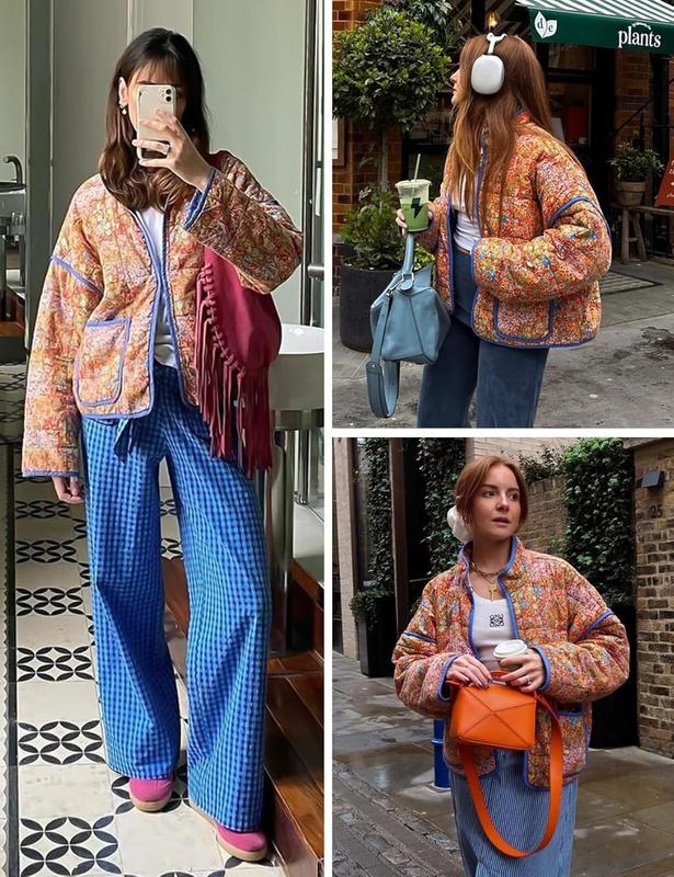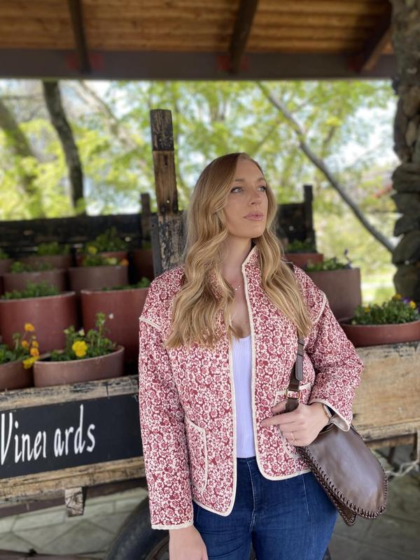 ✨ Elevate your style with the YeeZaa Women's Cropped Floral Quilted Jacket! This lightweight, open-front puffer coat features a boho floral pattern and a pull-on closure. Perfect for spring, autumn, and winter, it offers a loose fit and cropped length. Pair it with T-shirts, pullovers, jeans, and more for versatile looks. Machine wash or hand wash; no bleach.