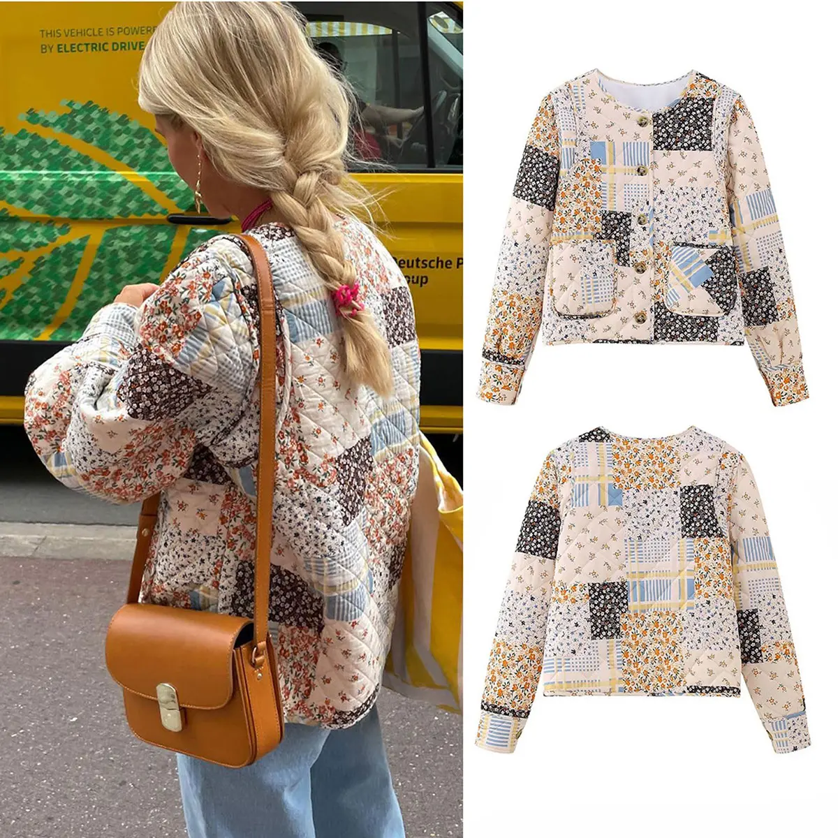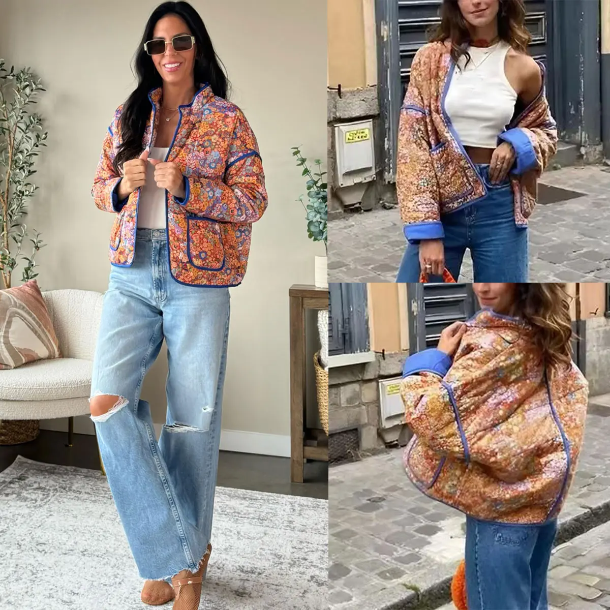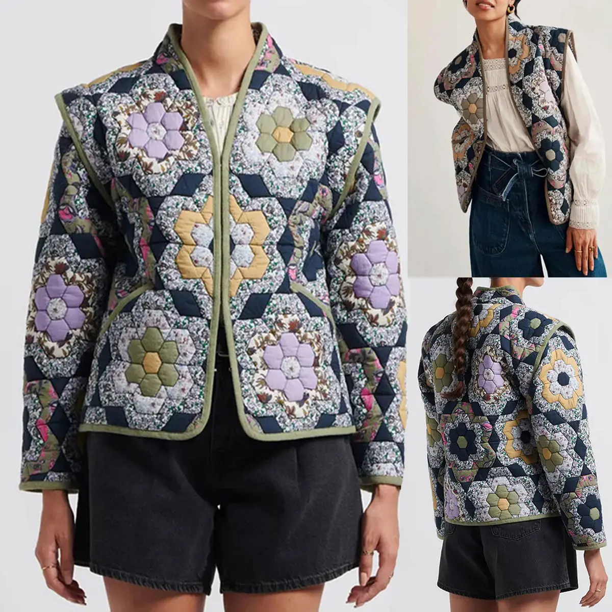 Details: This women's cropped quilted puffer jacket features long sleeves, a cropped length, drop shoulders, a floral pattern, and a lightweight, warm design. It is reversible, with an open front, making it cute and fashionable