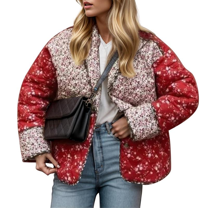 Vintage boho quilted coats for women are designed with long bat-wing sleeve, crop length, drop shoulder, floral pattern, open front, easy to take on and take off.